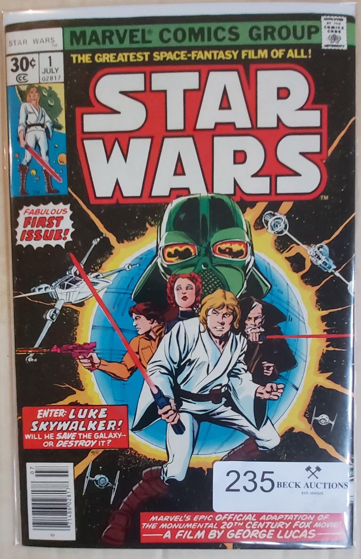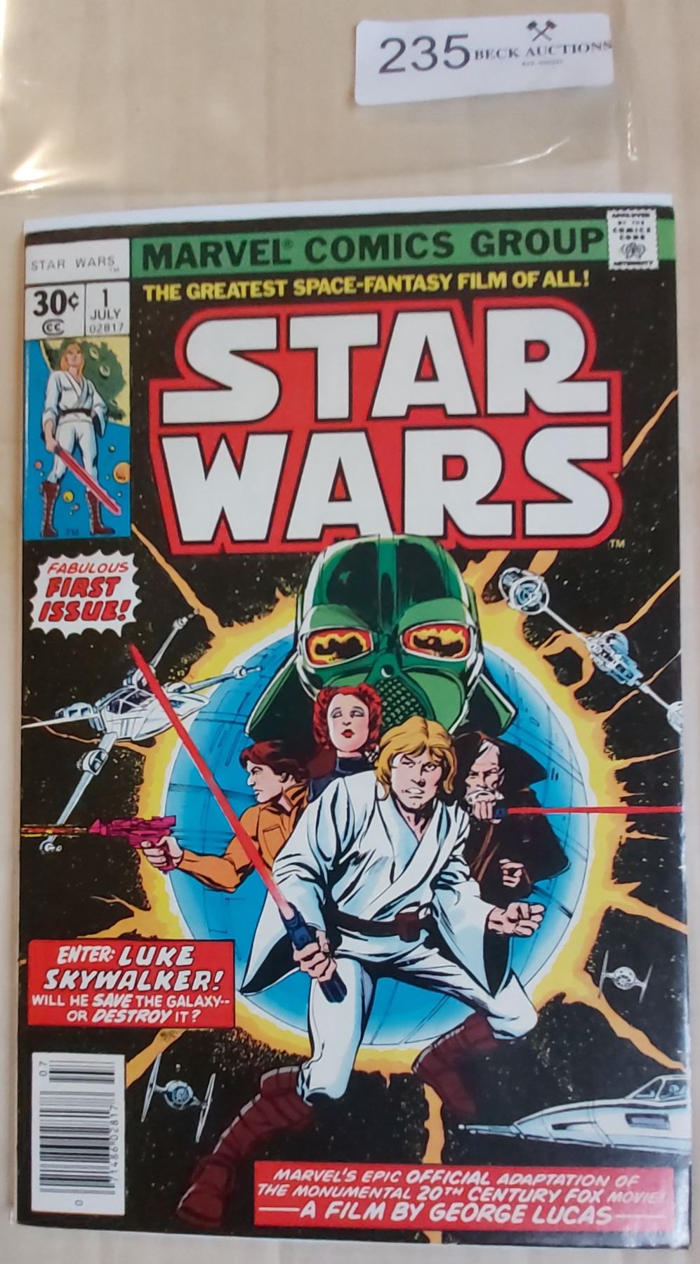 Star Wars #1 1977 30c Key Issue Marvel Comics Movie Adaptation. 1st appearance of Luke Skywalker, Leia Organa, C-3PO, R2-D2, & Darth Vader. 1st cover appearance of Han Solo & Obi-Wan Kenobi. First issue to comic series.