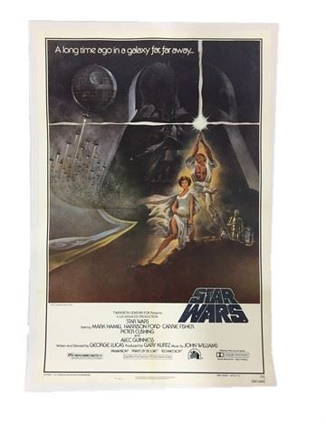 Star Wars (Lucasfilm Ltd.,1977) Original, first edition one sheet. Starring Mark Hamill and Carrie Fisher. Cotton canvas linen-backing. Very Fine. Minor creases, fold lines and some edge wear damage. (27" x 41"). This Star Wars poster comes directly from Carrie Fisher's personal collection and is also part of the Debbie Reynolds archive collection. This amazing memorabilia comes direct from the Debbie Reynold's archive collection.