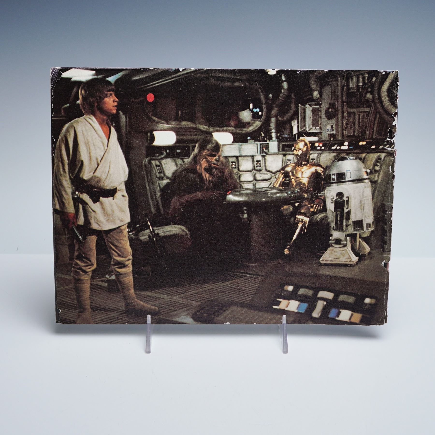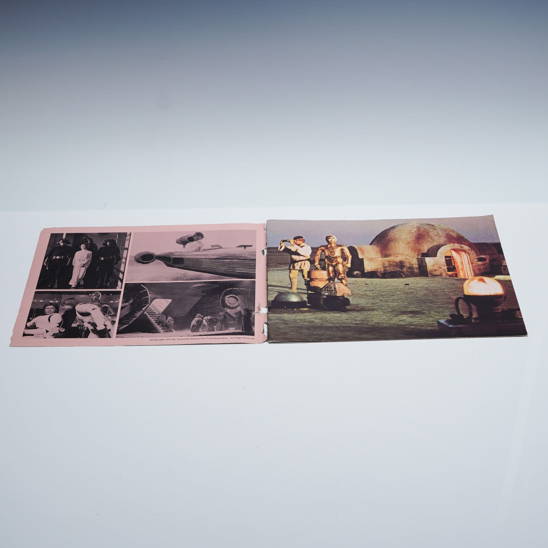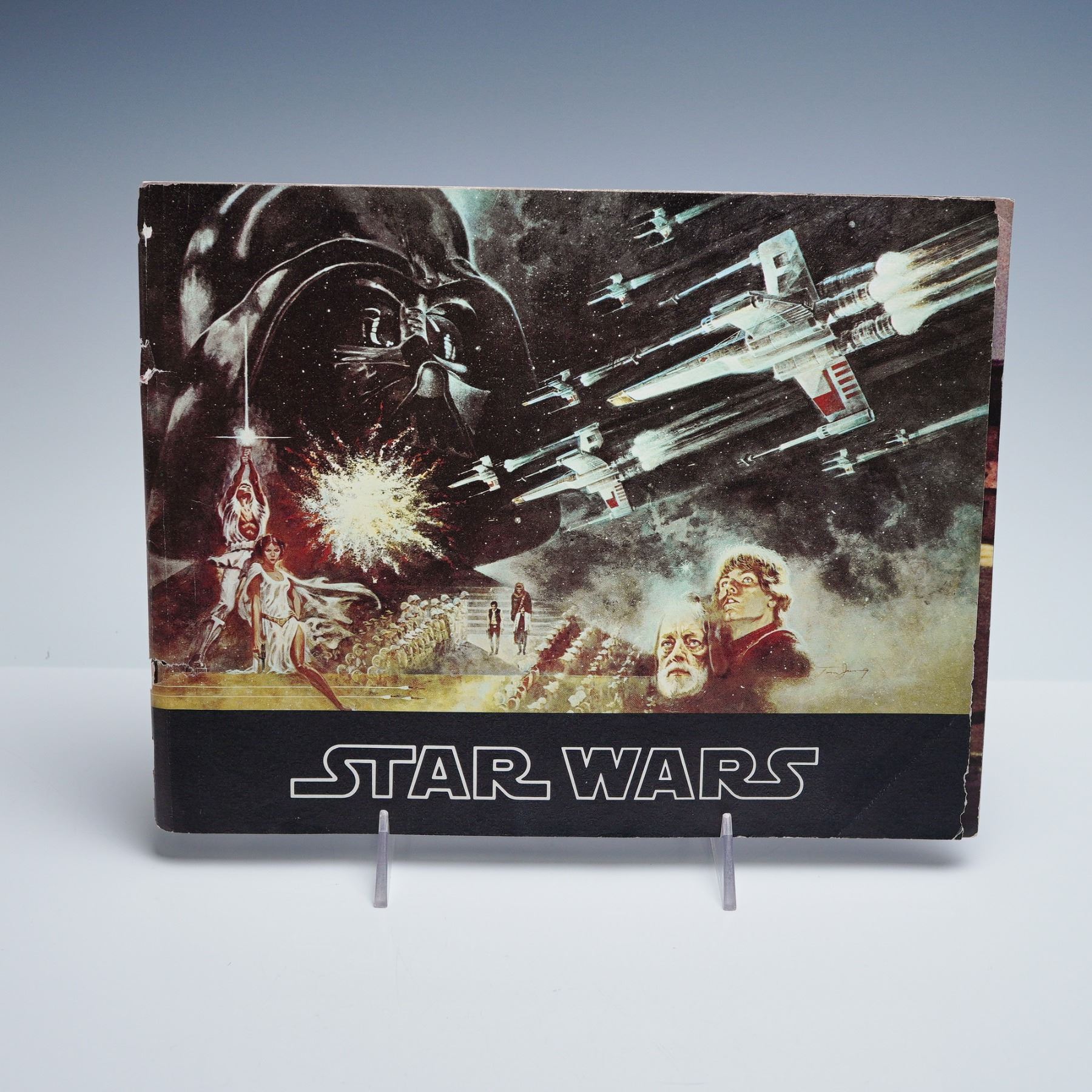 Original Star Wars souvenir program booklet from the 1977 film release featuring Luke Skywalker, Chewbacca, R2-D2, C-3PO, and Darth Vader. Includes full-color and monochrome production stills and artwork from the original movie. Measures 11.5"L x 9"H.
