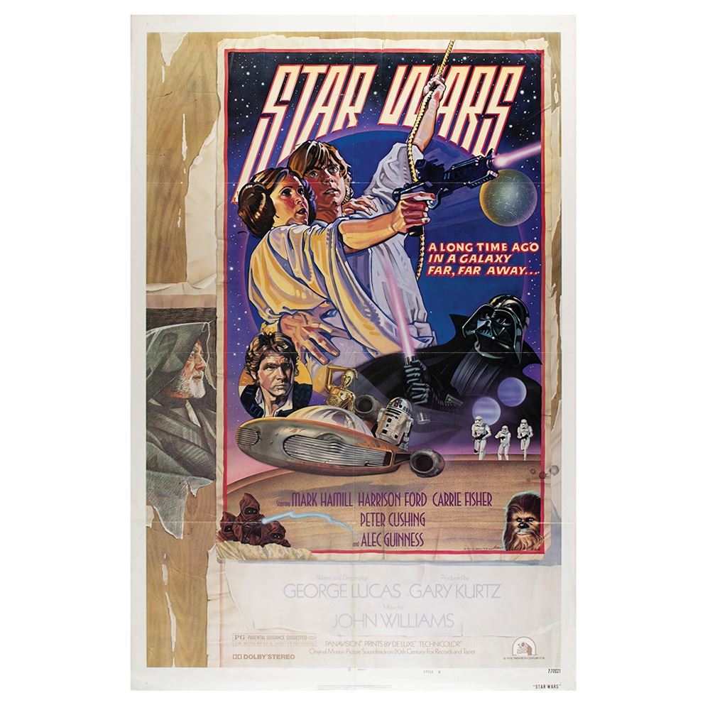 (20th Century Fox, 1978) Scarce original color 27 x 41 'Style D' or ‘circus style’ one sheet poster for the 1977 space opera Star Wars, which features incredible artwork design by Charlie White III and Drew Struzan of a tattered Star Wars poster peeling back to reveal a wooden fence or wall. The poster includes a wide variety of enduring Star Wars characters and symbols, such as: Luke Skywalker, Princess Leia, Hans Solo, Obi-Wan Kenobi, Chewbacca, R2-D2 and C-3PO, the Death Star, the Jawas, the landspeeder, stormtroopers, and Darth Vader with a Dracula-type cape. Large bold text to upper section reads: "Star Wars, A long time ago in a galaxy far, far away…" Lower portion features cast and crew credits and production details, with bottom border featuring NSS information and identified as “Style D, 77021, ‘Star Wars.’†In very good to fine, folded condition, with some light creasing to the borders, and the lower right corner. The D-style poster was produced for the 1978 summer re-release of Star Wars and is purportedly one of George Lucas' favorite posters for the film.