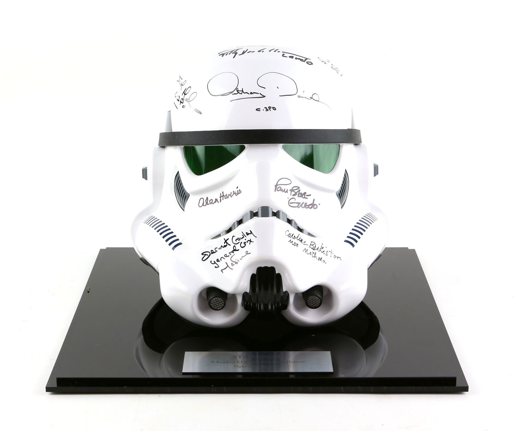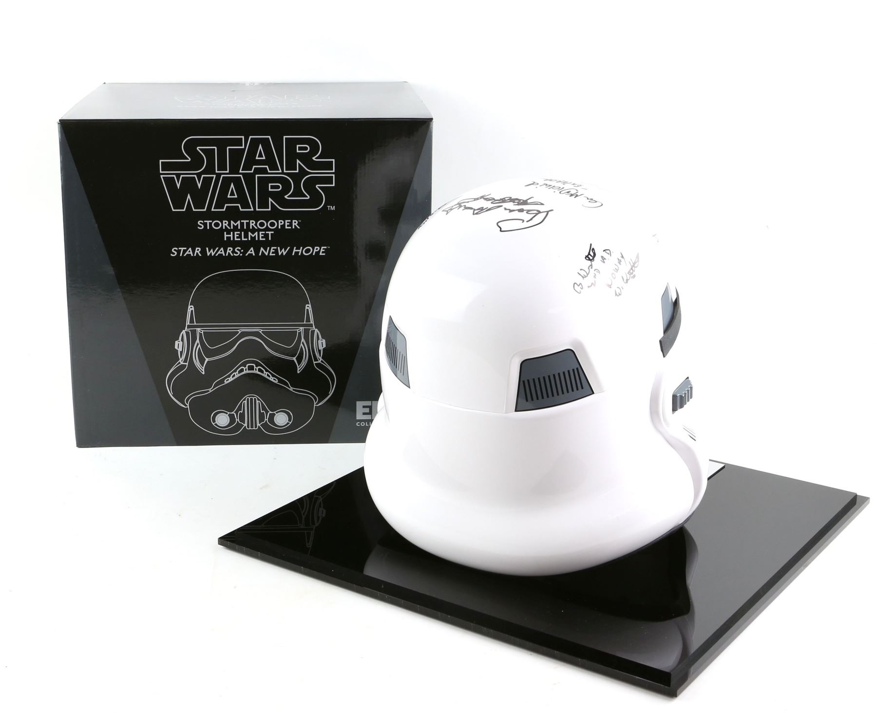 Star Wars - A New Hope - Signed official Prop replica Stormtrooper helmet, full scale produced by EFX Collectibles and signed in black by eleven members of the cast including Anthony Daniels, Peter Mayhew, Billy Dee Williams, Ian McDiarmid, Alan Harris, Bill Westley, Jim Marlow, Paul Blake, Quentin Pierre, Caroline Blakiston & Dermot Crowley. Displayed on a custom base with plaque, boxed.Provenance: Autographs were obtained in-person by the Vendor at MCM London & The London Film & Comic Con. With letter of provenance & a certificate from EFX Collectables.
