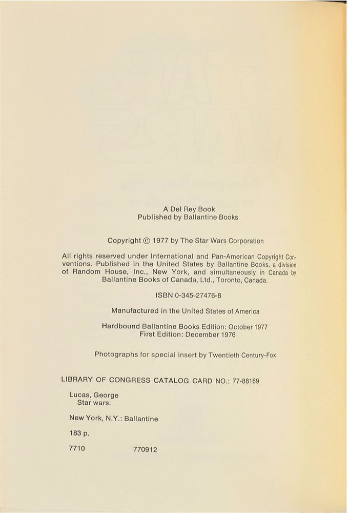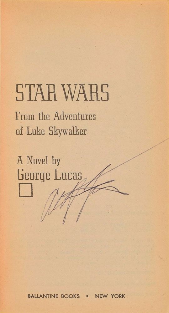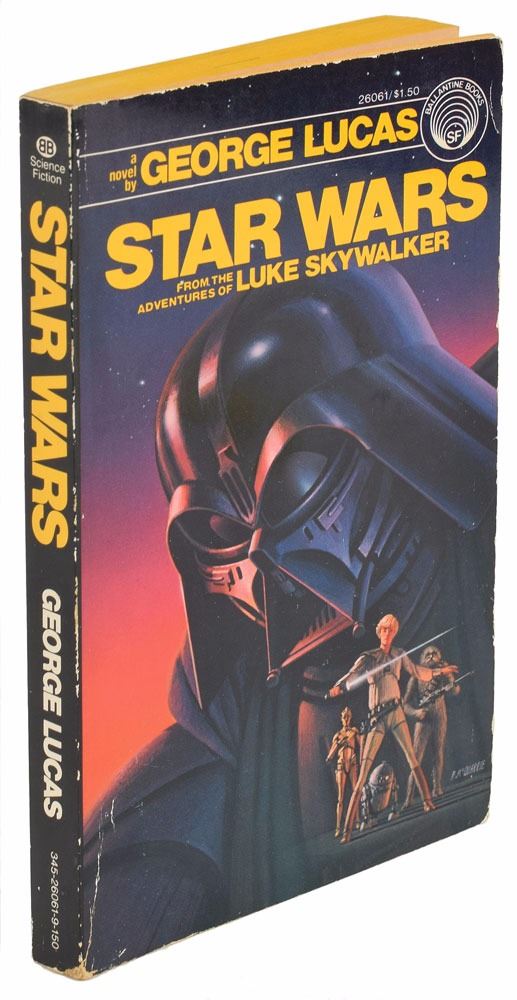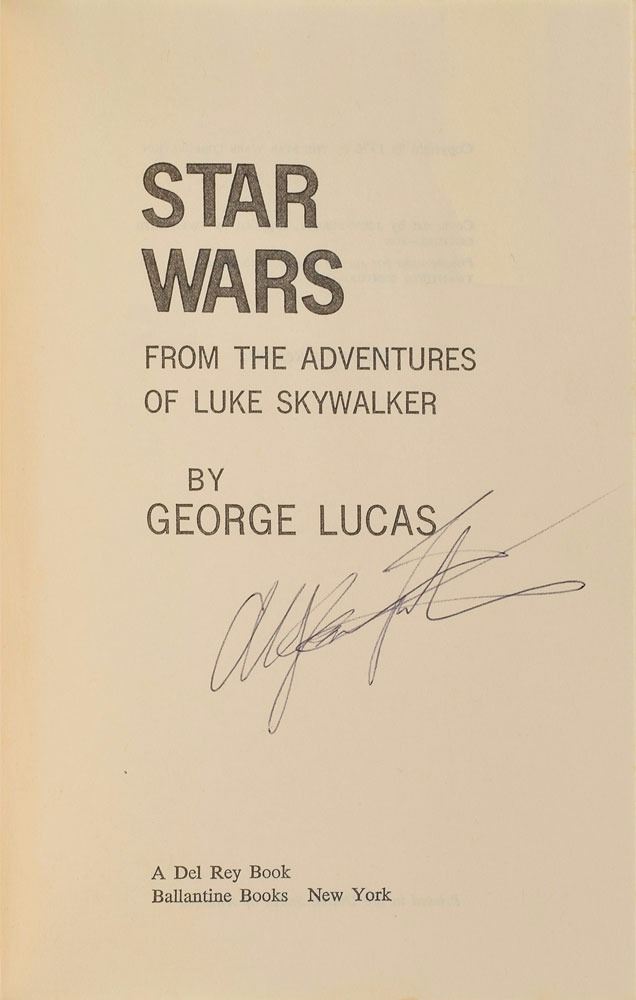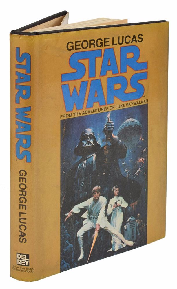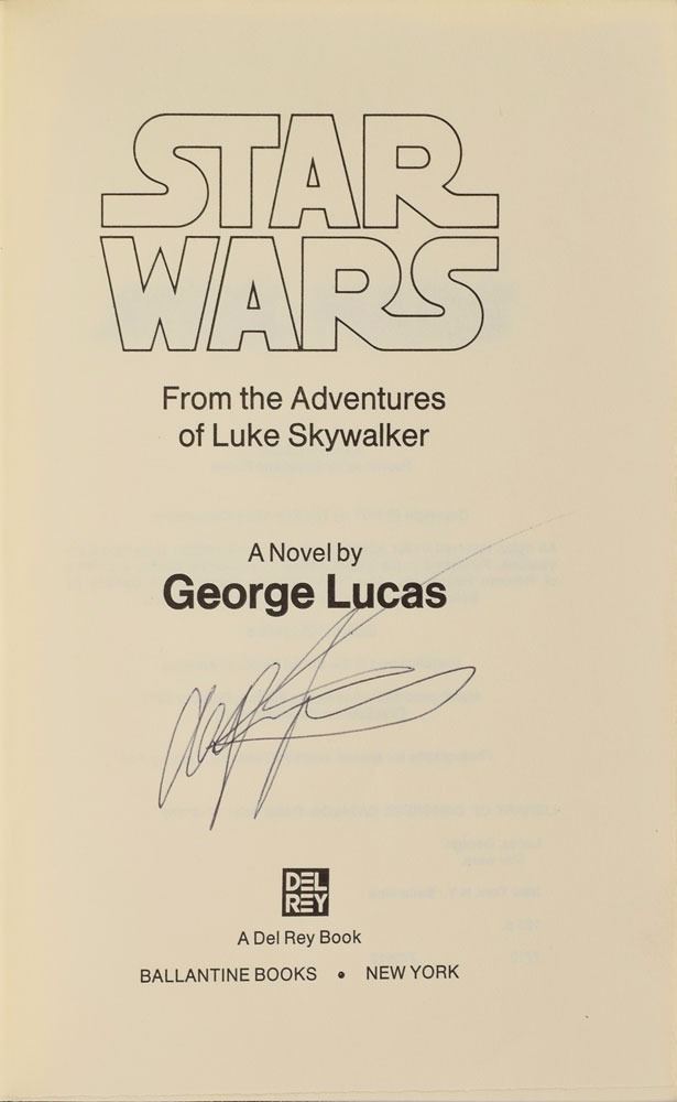 Writer of fantasy and science fiction (born 1946) known especially for his novelizations of film scripts. Remarkable collection of three first edition versions of the original Star Wars novel, credited solely to George Lucas but ghostwritten by Alan Dean Foster, each signed on the title page in ballpoint by Foster: the first appearance of Star Wars in print (December 1976), a paperback edition published by Ballantine Books; the first hardcover version (July 1977), with dust jacket, published by Del Rey as a book club edition, with key issue point of "S27" in the gutter on page 183; and the first printing of the trade hardcover by Ballantine (October 1977), with dust jacket ($6.95 price on flap). In overall very good to fine condition, with some scuffing and creasing to the covers of the paperback; edge tears to the dust jacket of the Del Rey book club edition, with some additional staining to boards, foxing to endpapers, and staining to edges of some interior pages; and some minor creasing to the dust jacket of the trade edition.