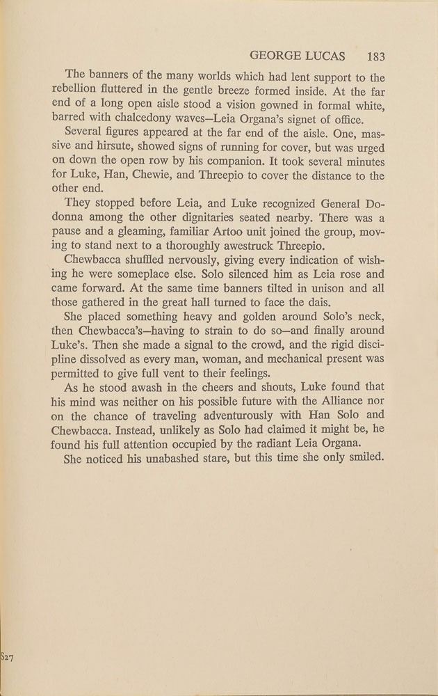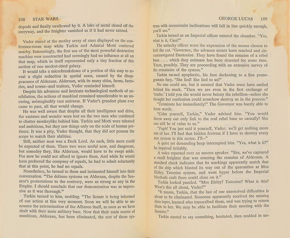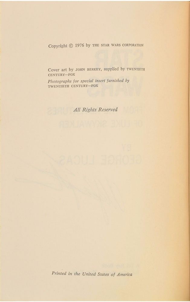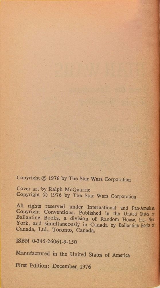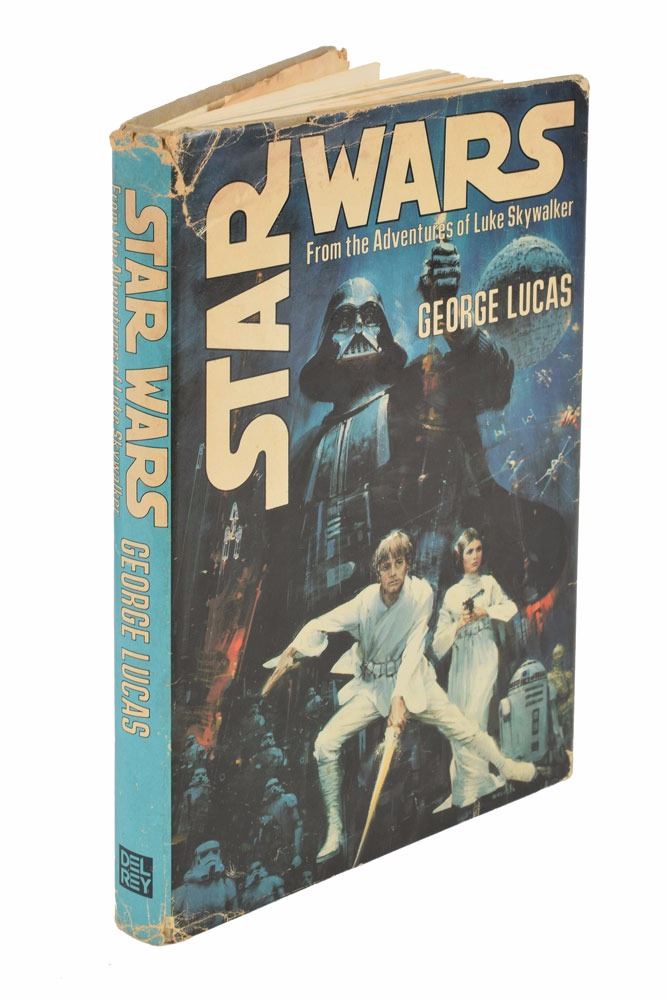 Writer of fantasy and science fiction (born 1946) known especially for his novelizations of film scripts. Remarkable collection of three first edition versions of the original Star Wars novel, credited solely to George Lucas but ghostwritten by Alan Dean Foster, each signed on the title page in ballpoint by Foster: the first appearance of Star Wars in print (December 1976), a paperback edition published by Ballantine Books; the first hardcover version (July 1977), with dust jacket, published by Del Rey as a book club edition, with key issue point of "S27" in the gutter on page 183; and the first printing of the trade hardcover by Ballantine (October 1977), with dust jacket ($6.95 price on flap). In overall very good to fine condition, with some scuffing and creasing to the covers of the paperback; edge tears to the dust jacket of the Del Rey book club edition, with some additional staining to boards, foxing to endpapers, and staining to edges of some interior pages; and some minor creasing to the dust jacket of the trade edition.