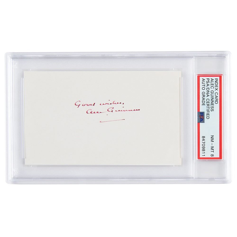 Nice ink signature of the Obi-Wan Kenobi actor, "Good wishes, Alec Guinness,& rdquo; on an off-white 5 x 3 card. In very fine condition. Encapsulated and graded by PSA/DNA as "NM-MT 8."