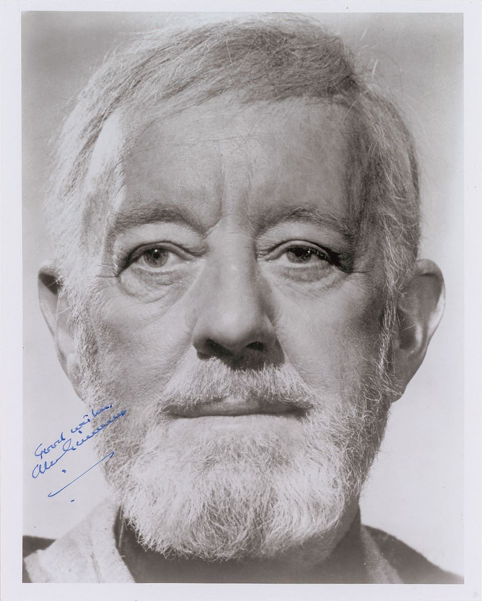 Very desirable glossy 8 x 10 photo of Guinness as Obi-Wan Kenobi, signed in ink, “Good wishes, Alec Guinness.” In fine condition.