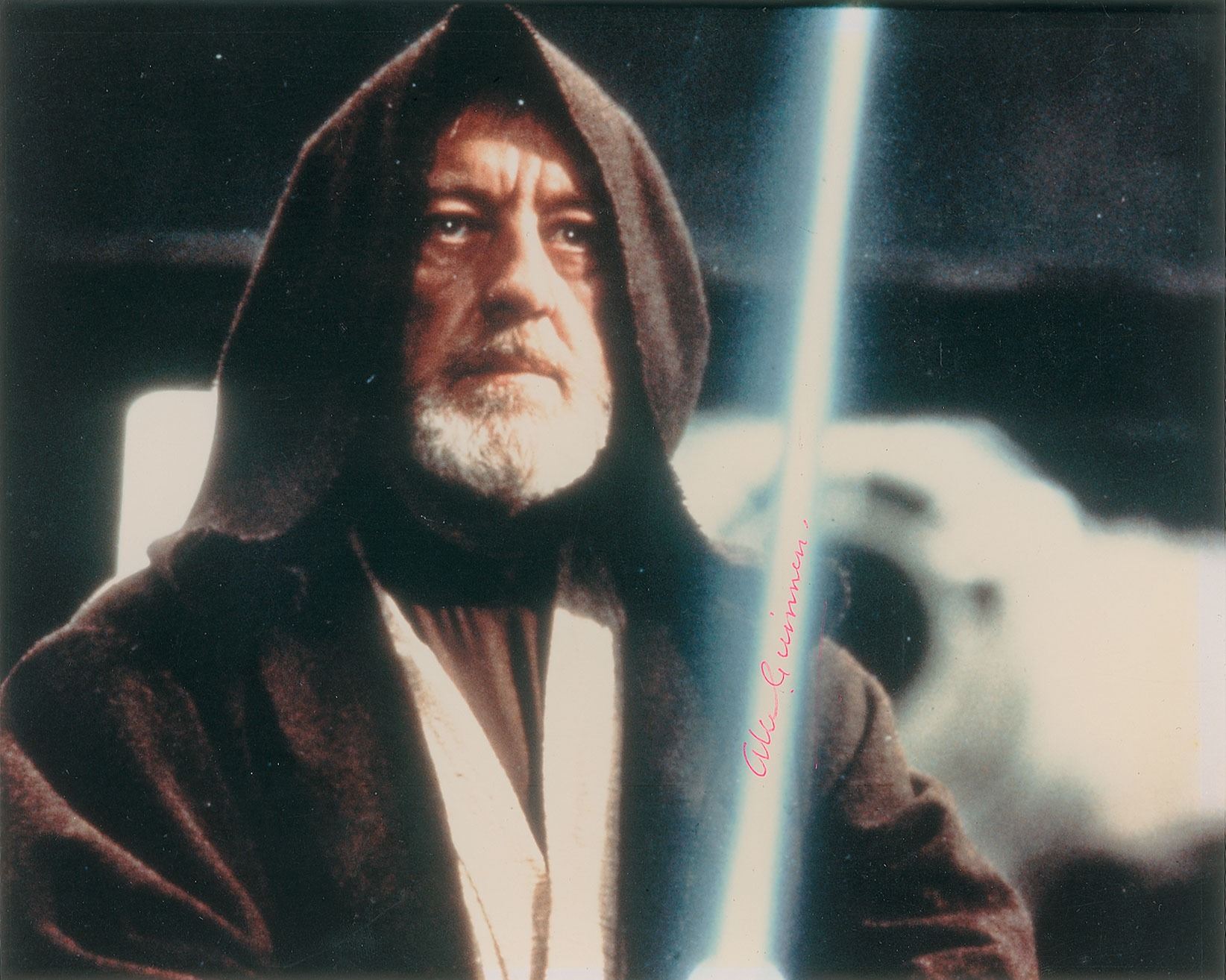 Appealing color glossy 10 x 8 photo of Alec Guinness as Obi-Wan Kenobi armed with a lightsaber during Star Wars, signed in pink ink. In fine condition, with some light surface impressions to his robe.