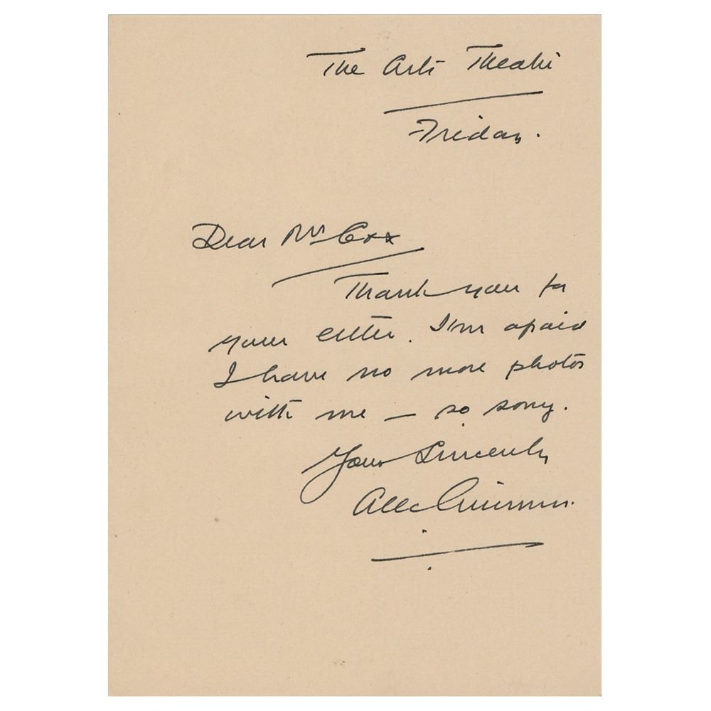 ALS, one page, 5 x 7, no date. Handwritten letter from "The Arts Theatre" to Mr. Cox, in full: "Thank you for your letter. I'm afraid I have no more photos with me—so sorry." In fine condition.