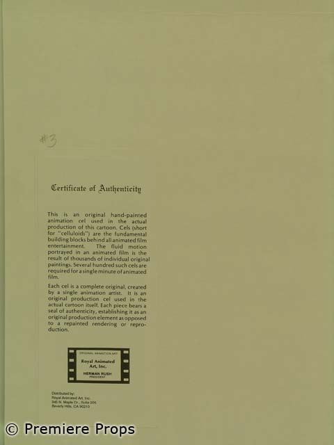 Premiere Props nor the consignor makes any warranties, expressed or implied, as to merchantability or fitness for a particular purpose, the correctness of the catalogue or other description of the physical condition, size, quality, rarity, importance, medium, provenance, exhibitions, literature, historical relevance of any property, intended use, condition of the property (including any condition report), correctness of description, origin, measurement, quality, rarity, importance, exhibition, relevance, attribution, source, provenance, date, authorship, condition, culture, genuineness, value, or period of the property. Additionally, neither Premiere Props nor the consigner makes any representation or warranty, expressed or implied, as to whether the Bidder acquires any copyrights, including but not limited to any reproduction rights of any property, or other intellectual property (including exhibition or reproduction rights) or whether the property is subject to any limitations such as ‘droit morale’ (moral rights) or other rights affecting works of art. Premiere Props does not make any representation or warranty as to title.