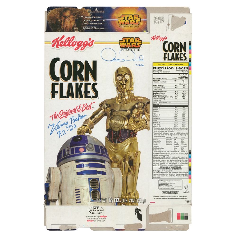 An unfolded Kellogg's Corn Flakes cereal box, 11 x 16.75, which shows droids C-3PO and R2-D2 for a promotion of Star Wars: Episode III – Revenge of the Sith, signed in blue felt tip, “Anthony Daniels, C-3PO” and “Kenny Baker, R2-D2.” In fine condition.