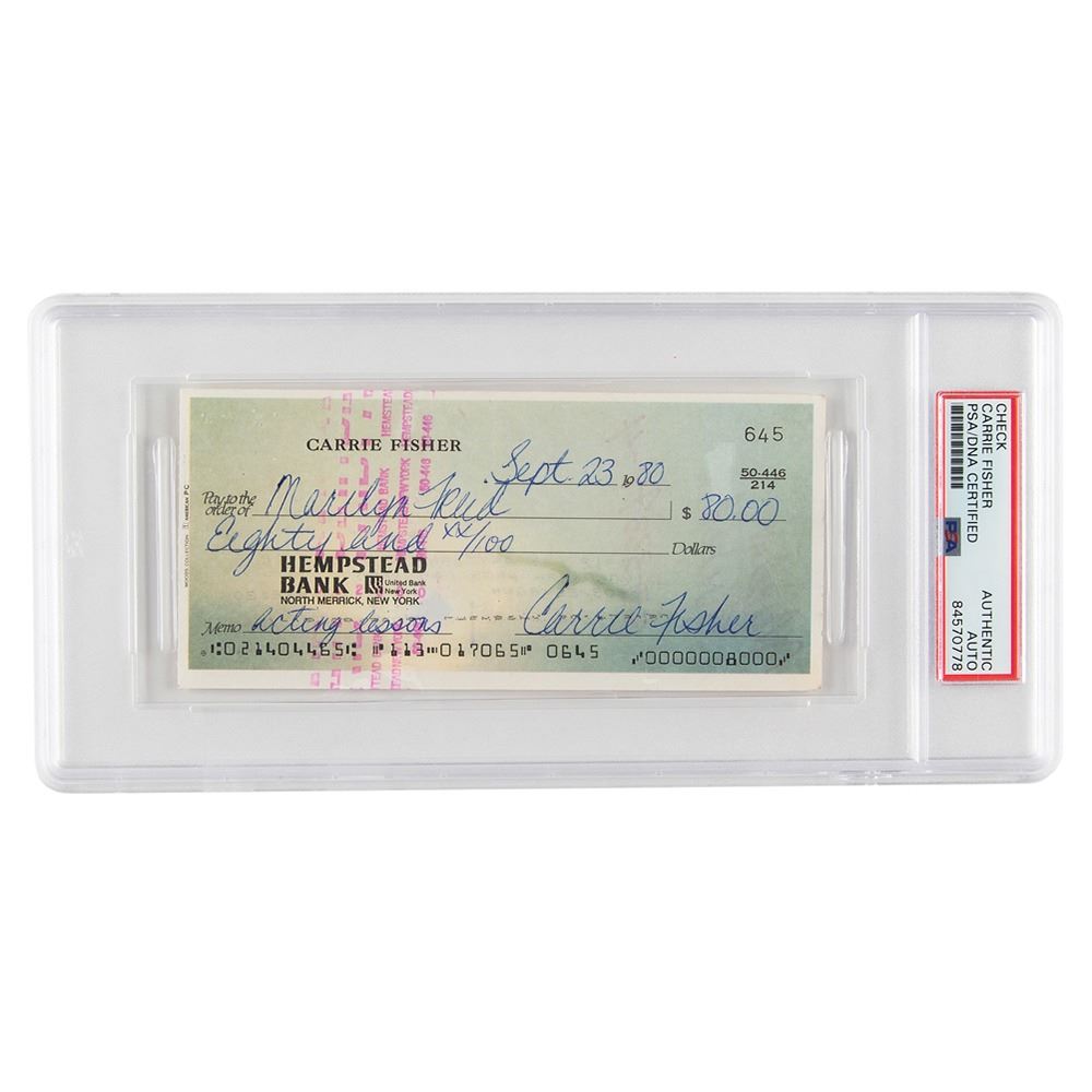 Very desirable personal check, 6 x 2.75, filled out and signed by Carrie Fisher, payable to her friend and acting coach Marilyn Fried for $80, September 23, 1980, with Fisher adding in the memo field: "Acting lessons." In fine condition. Encapsulated in a PSA/DNA authentication holder. Accompanied by a full letter of authenticity from JSA. A wonderful example that dates to her massive roles in The Empire Strikes Back and The Blues Brothers, and that also is associated with Fried, whom Fisher relied upon when she was first cast as Princess Leia.