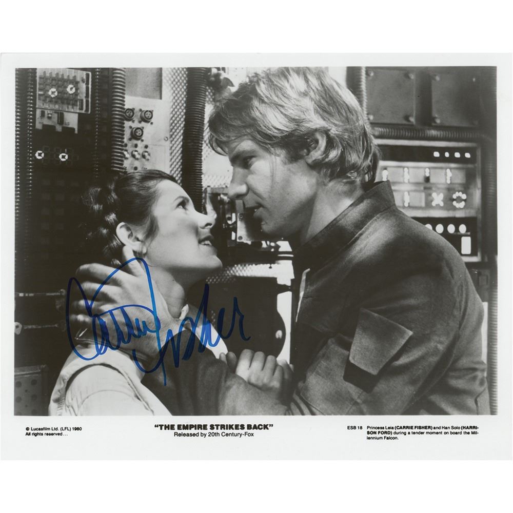 Glossy 10 x 8 publicity still of Princess Leia and Han Solo from The Empire Strikes Back, signed in blue felt tip by Carrie Fisher. In fine condition.