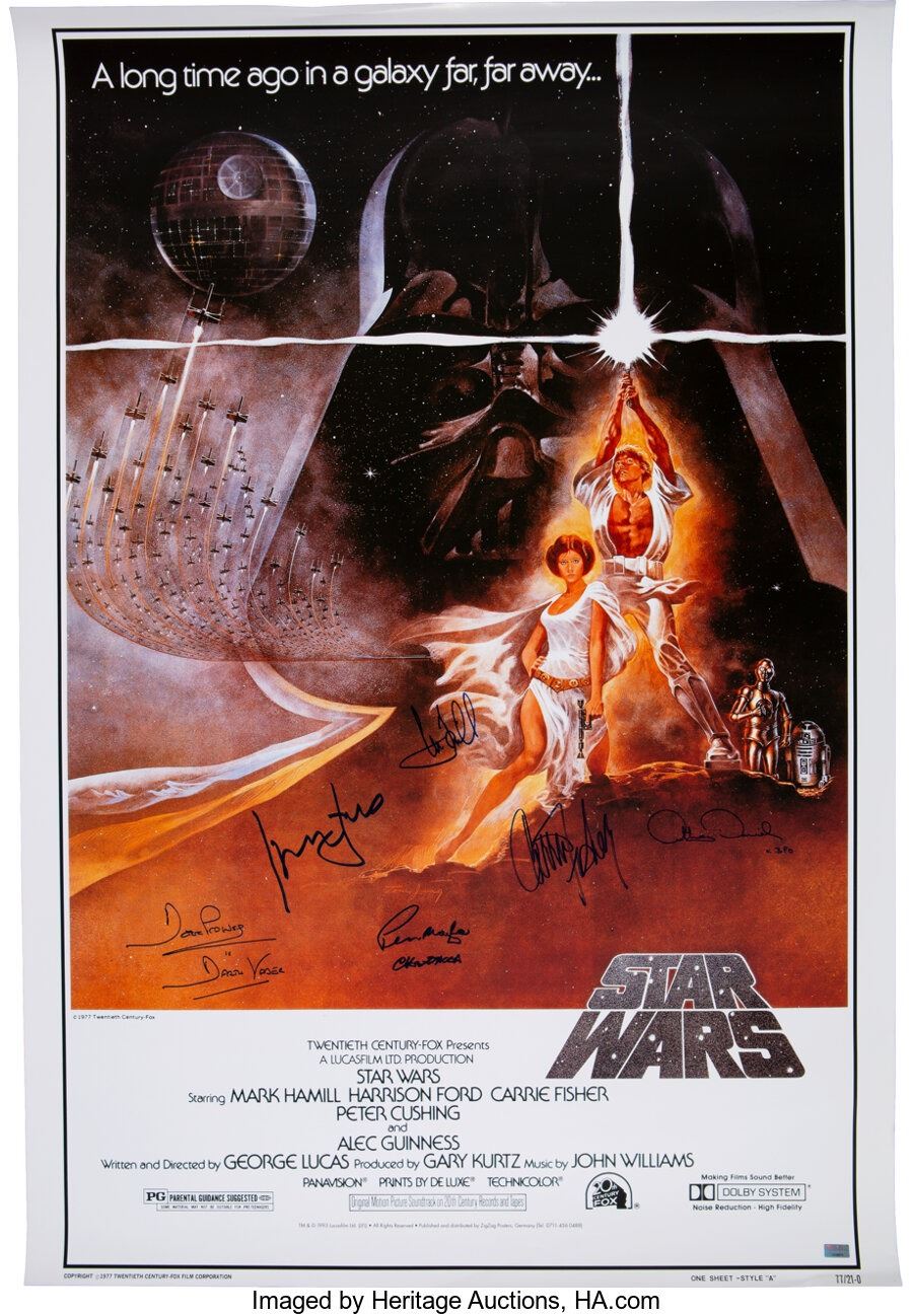Star WarsCast Signed Movie Poster. An early 1990s replication of the original 1977 one-sheet poster for what was then called Star Wars(later titled, Star Wars Episode IV: A New Hope) signed by six members principal cast members with various felt tips. Signatures include: Harrison Ford, Carrie Fisher, Mark Hamill, Anthony Daniels, Peter Mayhew, and David Prowse. Measures 27 ¼" x 39 ½". In Near Mint Minus condition with some handling wear in the upper right portion. COA cards (with pictures of the cast members signing it) from Celebrity Authentics. COA from Heritage Auctions.