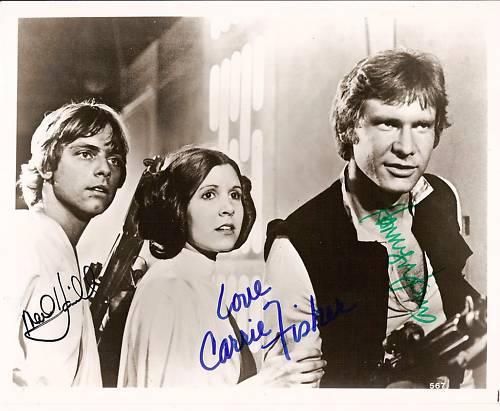 Nice signed photo of the three principal cast members of the original Star Wars movie. Signed, ''Mark Hamill,'' ''Love, Carrie Fisher'' and ''Harrison Ford.'' Signed in black, blue and green ink respectively. 10'' x 8'' glossy photo is in near fine condition.