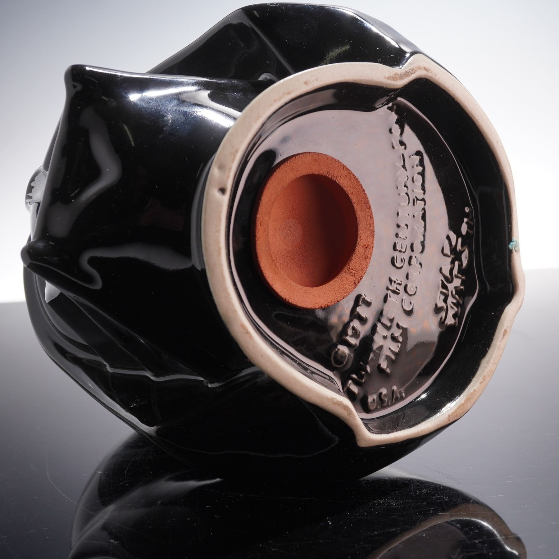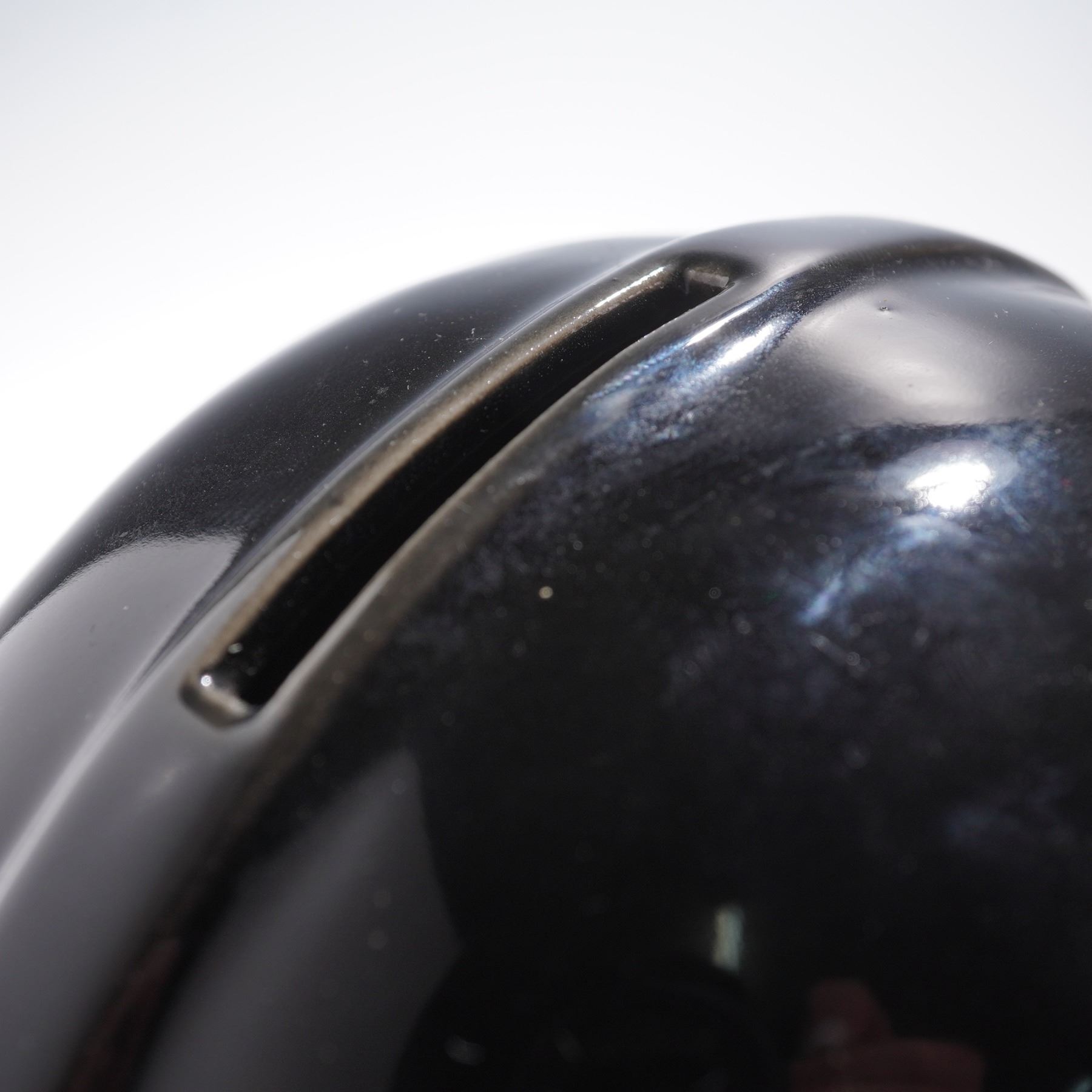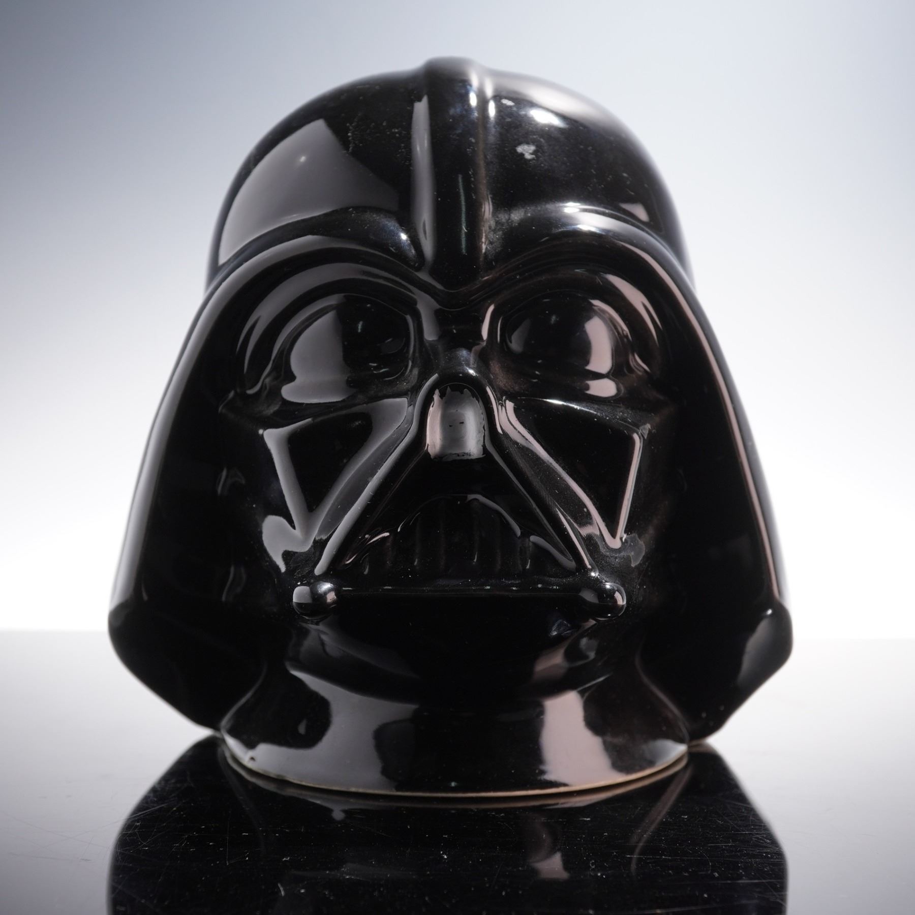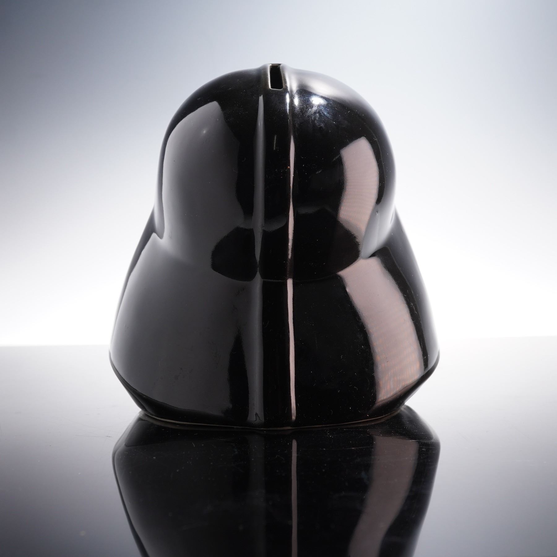 Vintage ceramic Darth Vader bank, officially licensed Star Wars merchandise, dated 1977 and marked by Twentieth Century Fox Film Corporation on the underside. The bank is finished in a glossy black glaze, faithfully capturing the iconic helmet design of the Sith Lord. Features a coin slot on the top and an opening at the base for coin retrieval. A nostalgic collectible for Star Wars fans and an excellent display piece representing the original trilogy era.