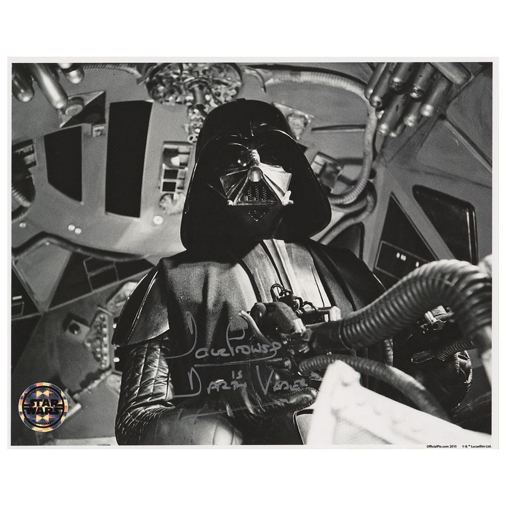 Satin-finish 10 x 8 photo of Star Wars villain Darth Vader, signed in silver ink, "Dave Prowse is Darth Vader." In very fine condition, with an official Star Wars label affixed to the lower left corner.