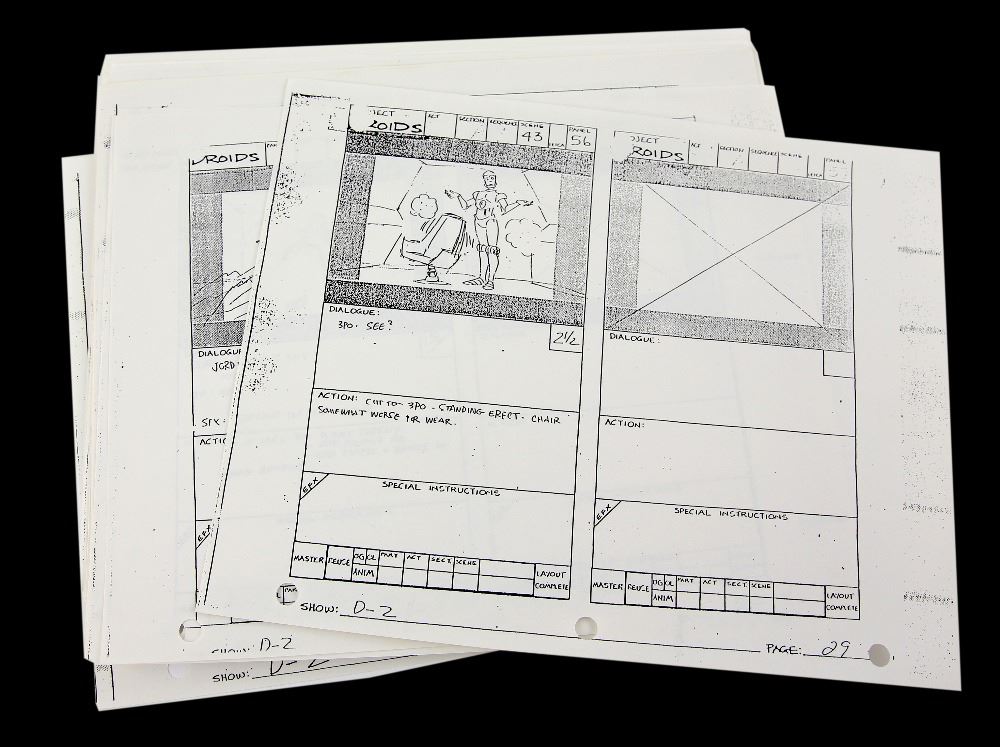 Star Wars: Droids – The Adventures of R2-D2 and C-3PO (1985) animated television series spun-off from the original Star Wars trilogy. Original photocopied Storyboards for Act One 'Escape Into Terror', Feb 8-1985 (Episode 2) where C-3PO, R2-D2, Thall and Kea sneak into the Fromm gang's secret base and steal the Trigon One weapon. 26 pages approx.