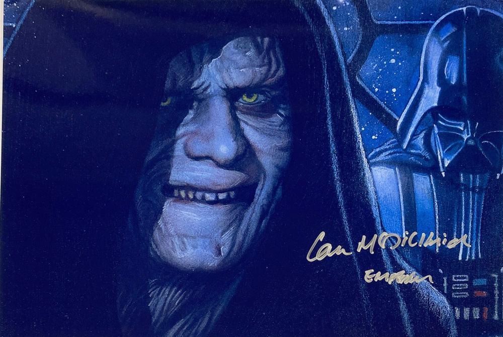 Star Wars Emperor Palpatine Ian McDiarmid facsimile signed movie photo. 8x10 inches. This item is a reprint of an original autograph