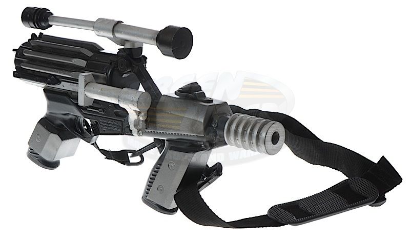 (20th Century Fox, 1999) A black-painted resin model of the CR-2 blaster, which were primarily used by the Naboo guards while they fought against the droid hoards in Star Wars: Episode I - The Phantom Menace. Based on a Calico M950A semi-automatic pistol, the blaster measures 17" x 9" and is adorned with silver-painted resin sights, stabilizers, and radiators. The muzzle shows signs of distress and repair, as well as mild distress throughout. Comes with attached shoulder strap.
