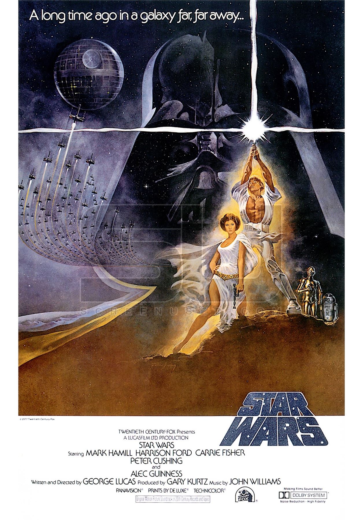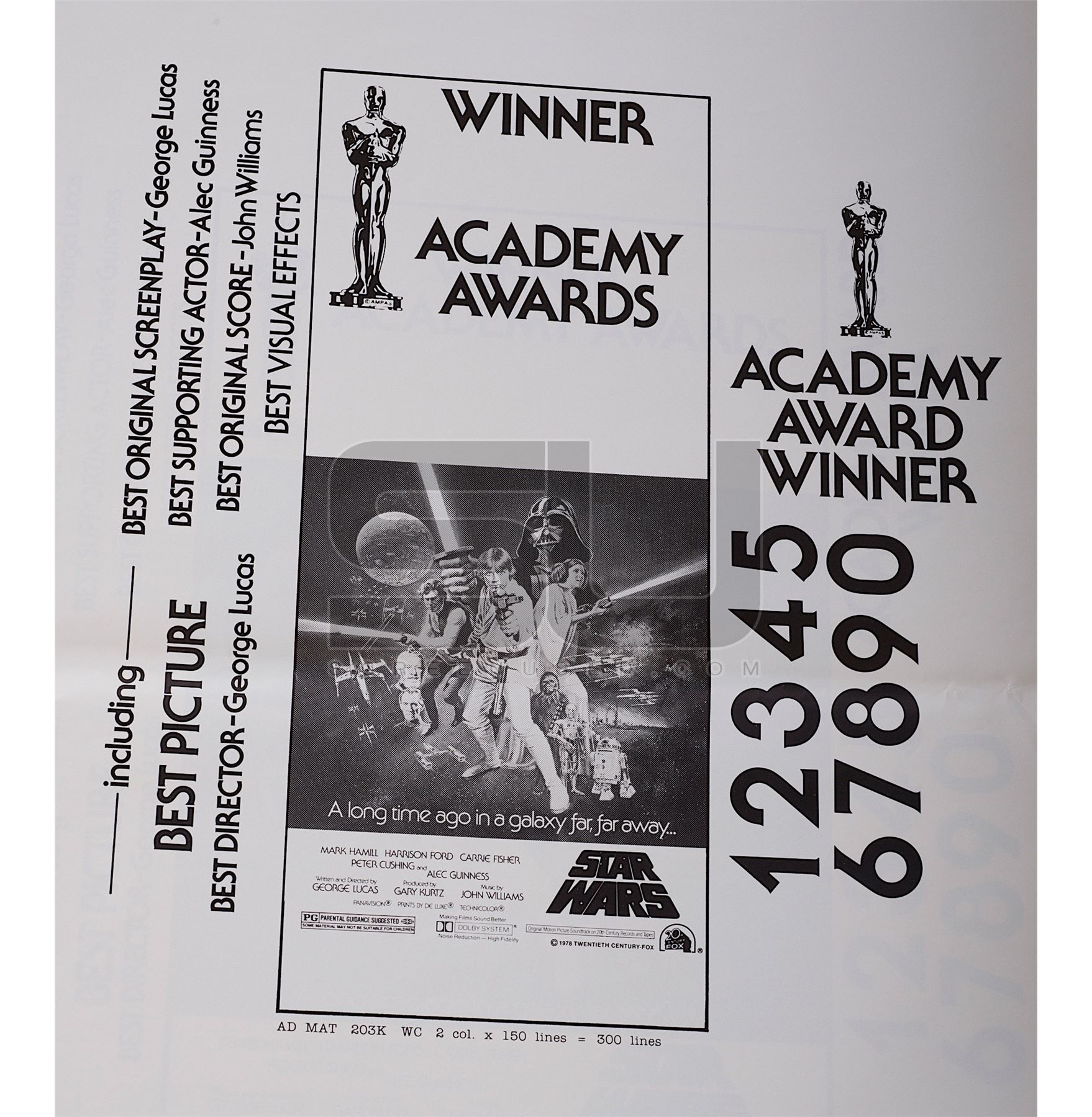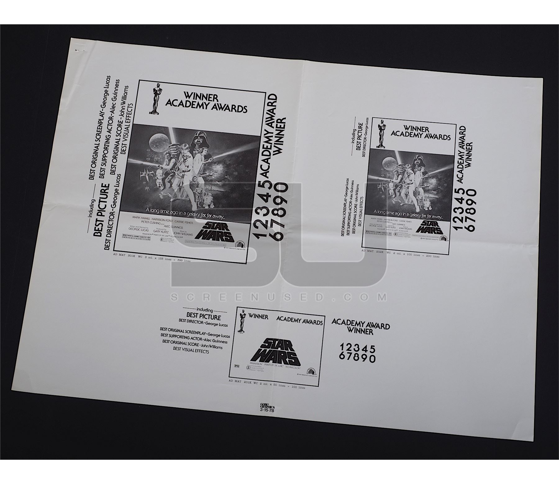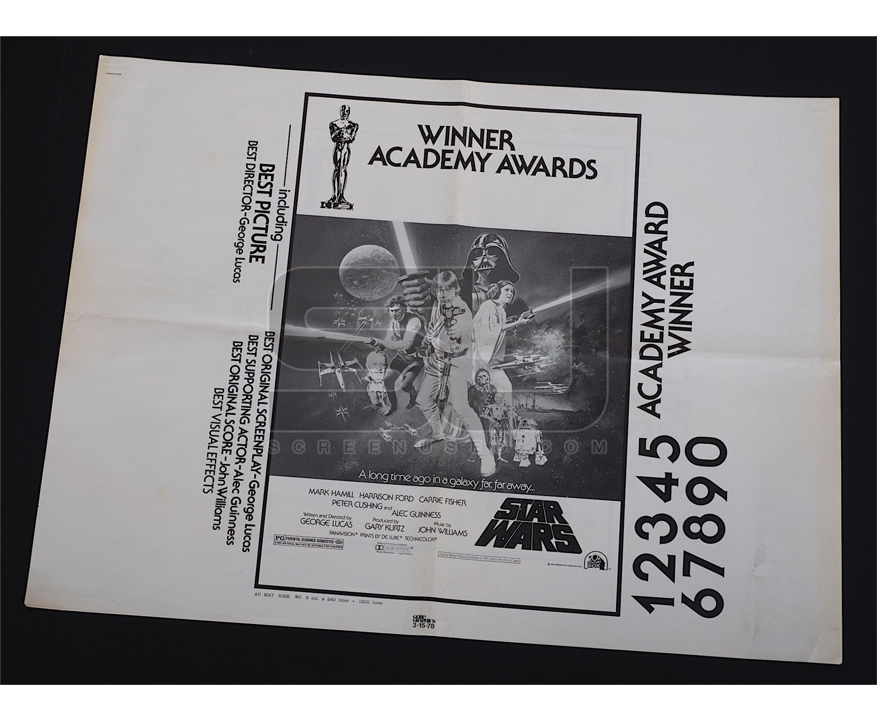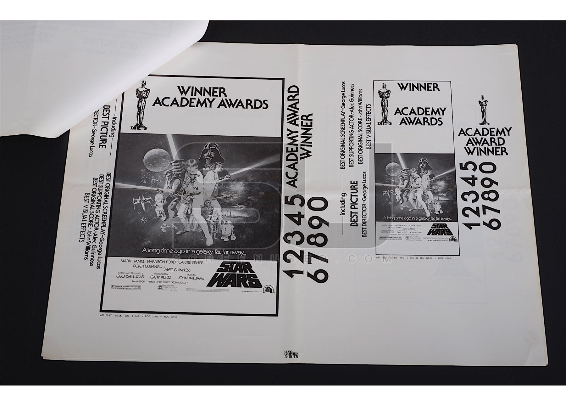 Original uncut pressbook printed on 3/15/1978, a few weeks before the Academy Awards were presented on 4/3/1978 featuring the image of the "Style C" poster artwork and listing some of the "winning" categories, including Best Picture, Best Director, Best Original Screenplay and Best Supporting Actor - Alec Guinness. Star Wars never won any of these Academy Awards, but it's common to have these types of things printed ahead of time to get a jump on advertisements the day after the Awards were handed out and with hype of the film, who would have thought that Star Wars would have lost in these key categories. As the awards were handed out to other winners, this printing would have been destroyed and a replacement would have been sent out to theaters to honor the correct winnings, but this extremely rare version did survive. Consists of five pages with minor wear from storage, last page is loose from the single staple. Measures 19" x 25". A very rare early Star Wars artifact.