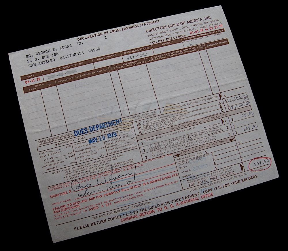 (LucasFilm, 1980) An original Directors Guild of America earnings statement dated 3/31/1979 and signed by George W. Lucas Jr. This is an extremely rare vintage document with full name signature of legendary "Star Wars" creator George Lucas. Like other celebrities, George Lucas drastically changed the way he signed over the years to accommodate the large number of requests for autographs, reducing it to a simple "GL". Original vintage signatures such as this have become a holy grail for collectors. The interesting thing about this document is that it was filed during production of "The Empire Strikes Back", the film that caused Lucas to quit the Directors Guild of America. He resigned from the guild because the guild fined him for placing Irvin Kershner's directing credit at the end of The Empire Strikes Back (even though Kershner himself did not object). Document measures 8.5" x 7" and remains in very good condition.