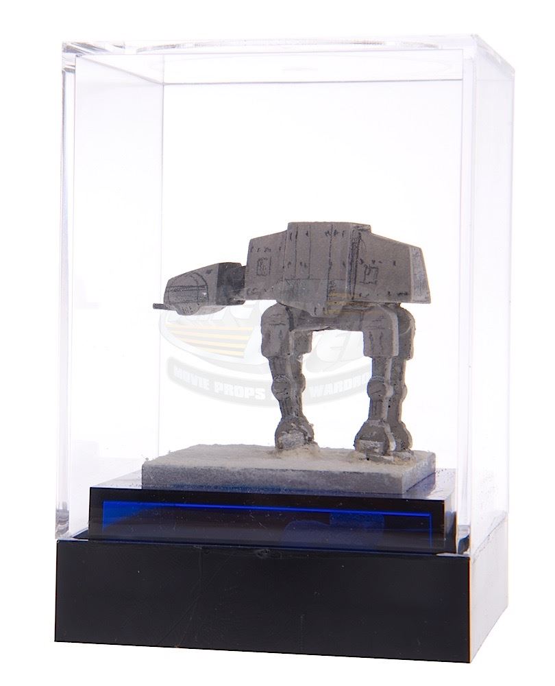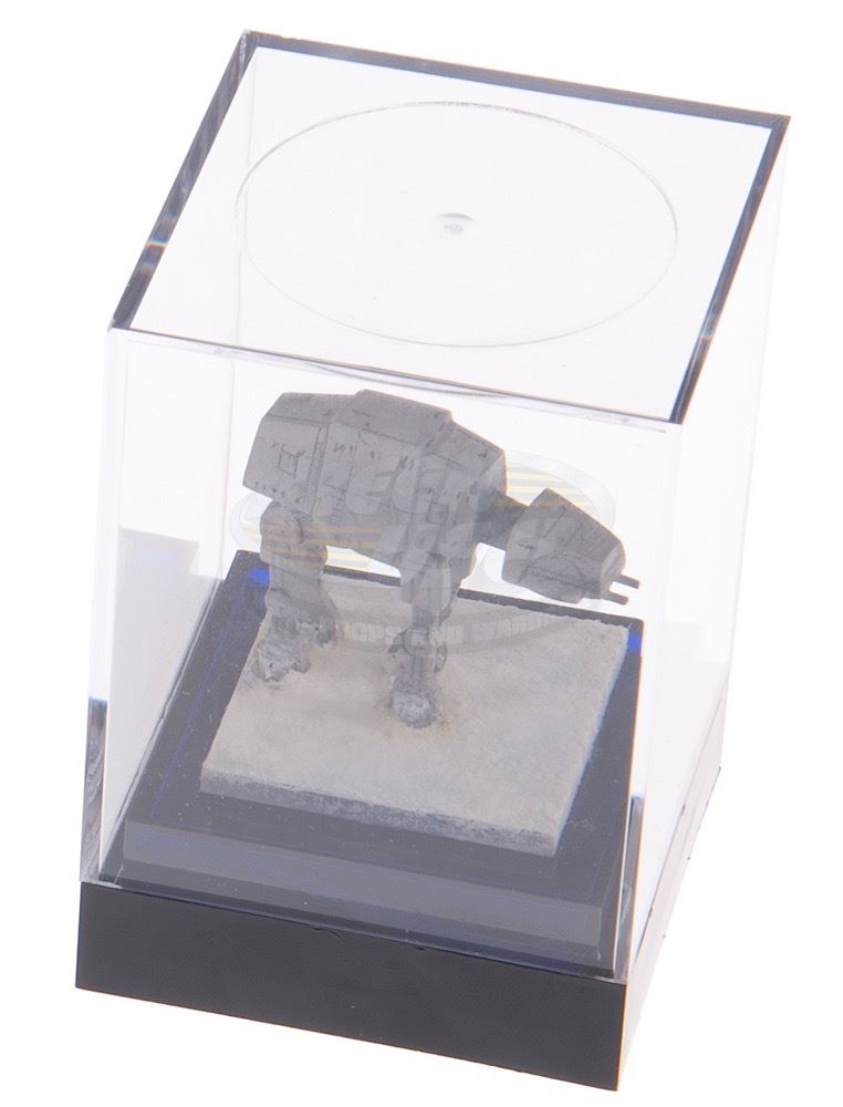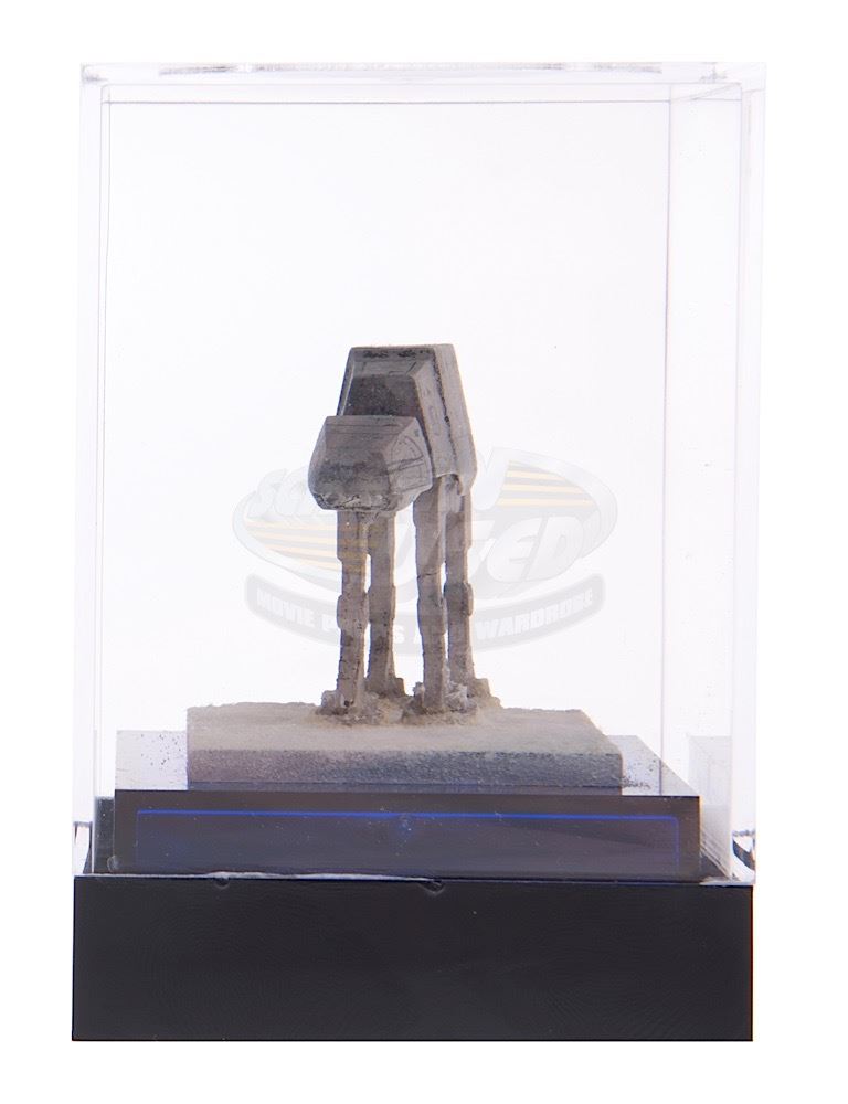 (LucasFilm, 1980) This AT-AT miniature was created by an original (Empire Strikes Back) ILM model maker for display after filming. The five originals made for filming in this size were used during the extreme distant shots. Measuring only 1.5" long, this size was the smallest scale AT-ATs made for the production. The Imperial Walkers were one of the most impressive creations of the original Trilogy and this is a very rare opportunity to own a version built from the original mold used to make the original filming miniatures. This miniature is made of urethane casting resin and detailed with paint and pencil. The miniature is presented in a plastic case for display.