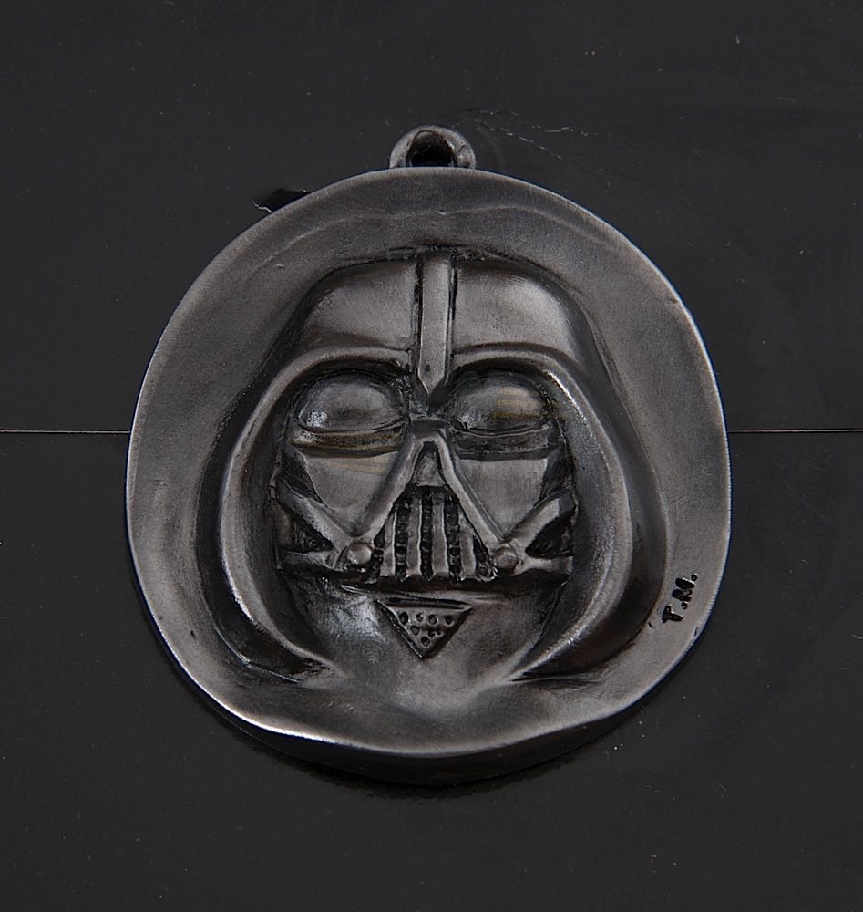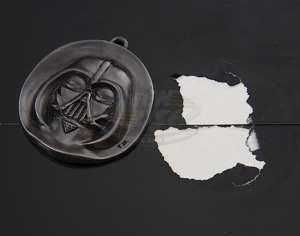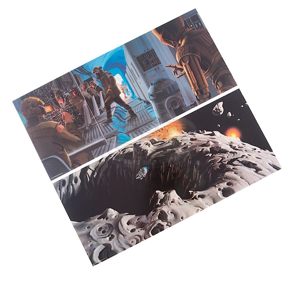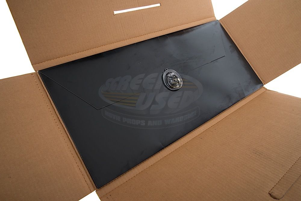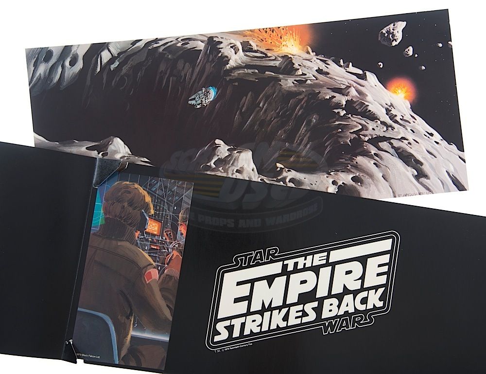(20th Century Fox, 1980) A rare limited edition artwork portfolio released to theaters and potential investors prior to the release of Star Wars Episode V: The Empire Strikes Back. Presented in a silk screened black box featuring the image of Darth Vader, the portfolio is sealed with a metal medallion featuring Vader's face. Contained within an interior envelope is a set of two prints of concept art created by the legendary artist Ralph McQuarrie, depicting the Rebel base on Hoth and the escape of the Millennium Falcon after fleeing Hoth.
