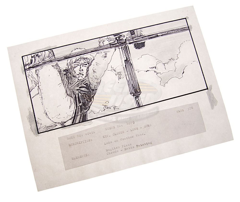 (LucasFilm, 1980) A very rare original hand drawn storyboard featuring Luke Skywalker clinging to a weather vane under Cloud City. The storyboard is accomplished in pencil, pen and marker with typed filming details added below the drawing. Measures 10" x 7.5".