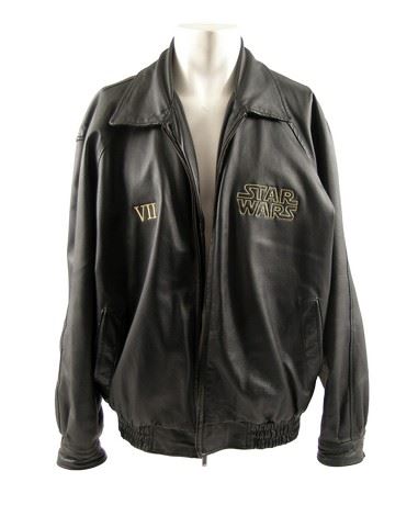 Direct from the production department from Star Wars Episode VII is this specially gifted official crew jacket. The jacket features black leather long sleeves with Star Wars patches on the front. It is a 'Oscar Piel' jacket and size large.