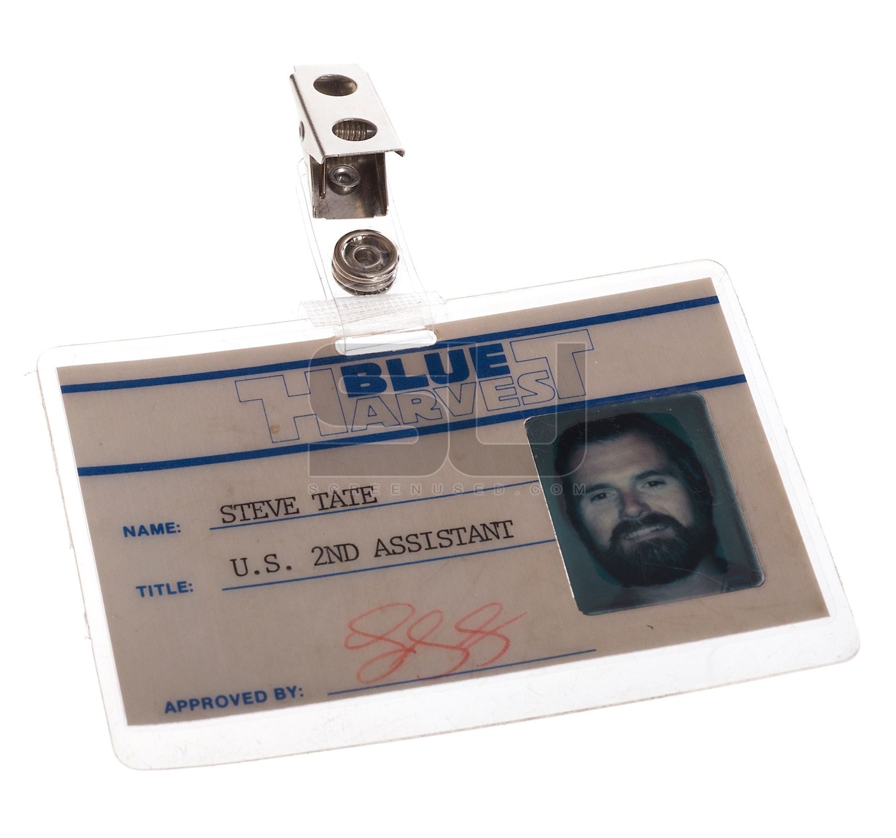 This laminated badge was issued to Steve Tate, the Second Assistant Cameraman of Return of the Jedi, filming under the faux name, "Blue Harvest", to access the filming locations in the United States. "Blue Harvest" was the name and logo used during filming to minimize attention to the new Star Wars film. The badge features Mr. Tate's image, name, title and is an extremely rare production artifact from the production.
