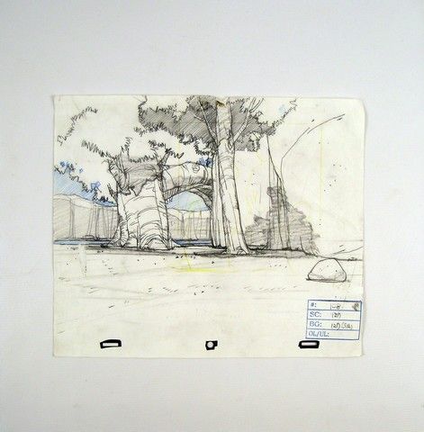 A rare original pencil animation background of the forest of Endor for George Lucas' classic animated series "Star Wars: Ewoks" (1985). It also includes the yellow pencil perspective drawings of the characters walking in the foreground. It is drawn on the original animation keyed paper with the official tracking stamp. Reads: "#108. SC:12D" Approx 12.5"x10.5".