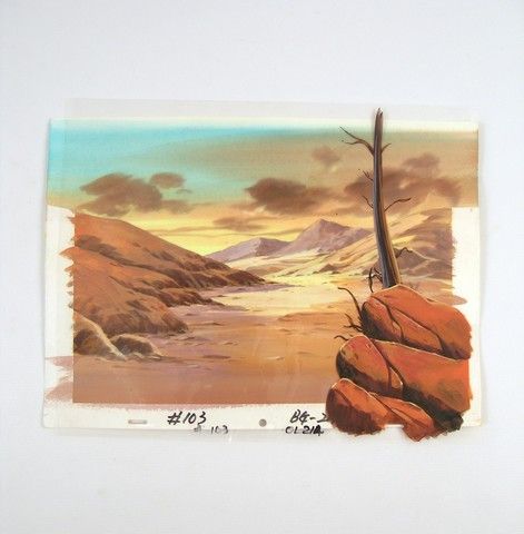 A beautiful original color animation background and acetate cel perspective "overlay" of jutting rocks and tree on the forest moon from George Lucas' animated series "Star Wars: Ewoks" (1985). Both are drawn on original animation keyed paper. The cel utilizes the classic and now extinct technique of "backside" color fill-in. both include the animator's codes with #103-OL214 for the cel ("OL" meaning "overlay"), and #103-BG214 ("BG" for "background"), for the over large background artwork. Background is 14"x10" and the cel is 13.5"x11".