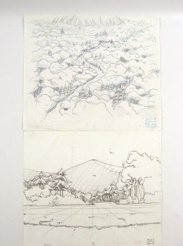 Two astonishingly detailed pencil background drawings of the Forest of Endor for George Lucas' classic animated series, "Star Wars: Ewoks" (1985). The first is blocked out to show exacting perspective of ground, trees, mountain and sky, and the second is a painstakingly rendered "bird's eye view" of the forest, with the river (the one with the iconic suspension bridge) running through it. Both production drawings evoke brilliantly the mystical world including the full forest and Mount Sorrow. Both are drawn in pencil on the original production keyed animation paper. The first has "#109-BG-5" ("BG" for "background") writing in the lower right hand corner and the second #109 BG126" written in the right hand corner. They are both approx 12.5"x10.5".
