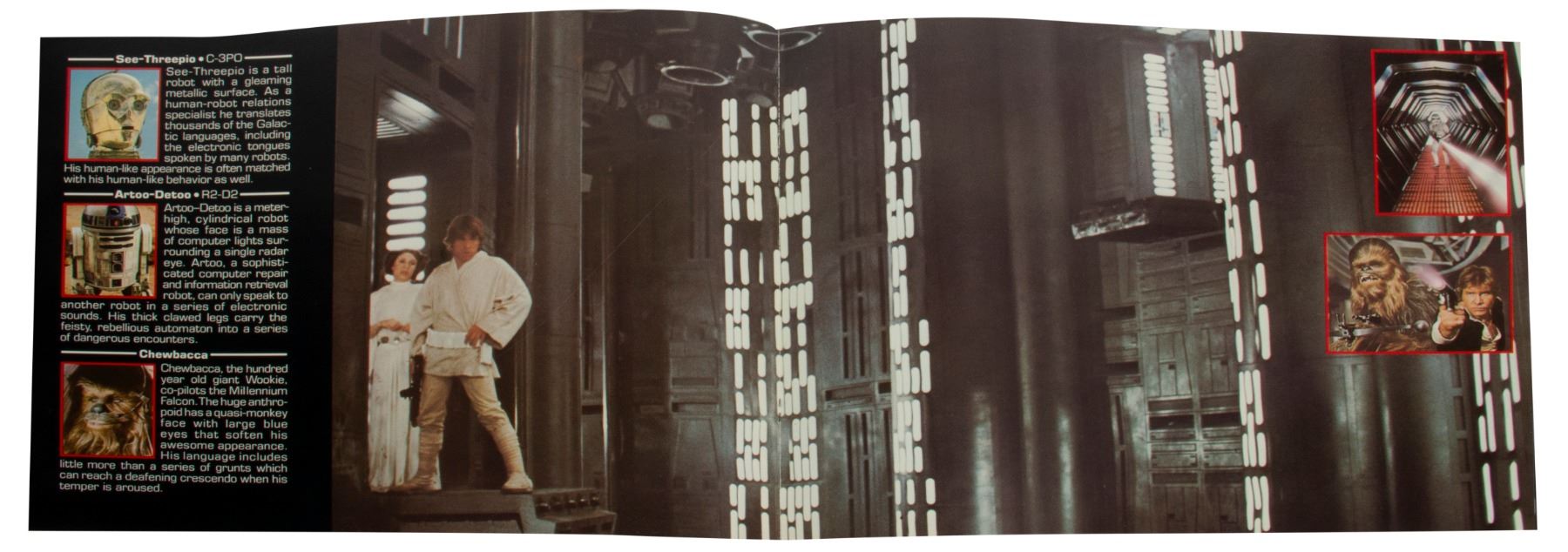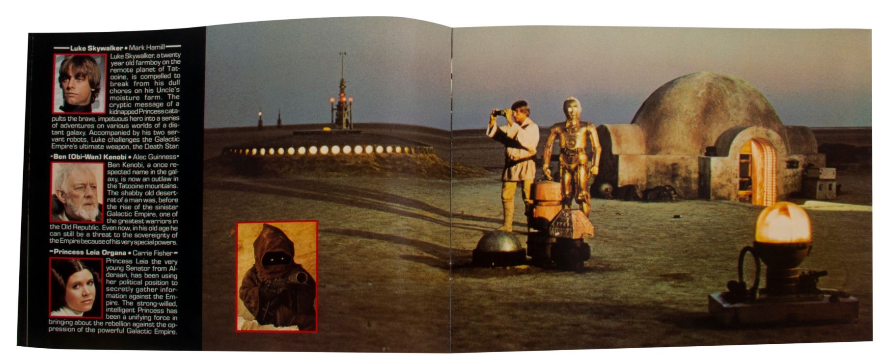 (20th Century Fox, 1977) An extremely rare pre-release book created for potential exhibitors of "Star Wars" in 1977. Prior to the release of the film, these lavishly created books full of high quality photos and descriptions of the characters were sent to movie theaters to inform them about the upcoming film and ideally, help the film's performance at the Box Office. The book simply reads "Star Wars" in large font on the cover, and contains 28 pages of fascinating information and imagery from the film. One portion reads, "Six years ago, George Lucas, the man who brought you American Graffiti, began his first draft of a film that very well may become a milestone in the space fantasy genre". This very rare book measures an impressive 11"x14" and is in very good condition with some cover wear from use and storage.
