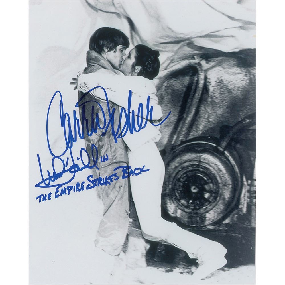 Satin-finish 8 x 10 photo of Luke Skywalker and Princess Leia kissing, signed in blue felt tip, "Carrie Fisher" and "Mark Hamill in The Empire Strikes Back." In fine condition.