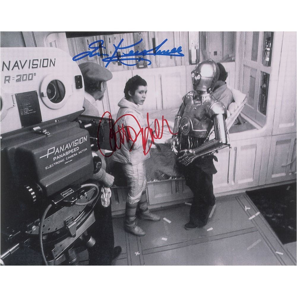 Satin-finish 10 x 8 photo taken on the Star Wars set, signed in blue felt tip by Carrie Fisher and director Irvin Kershner. In very fine condition.