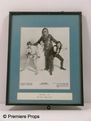 Star Wars (1977) framed in a metal frame movie photo featuring Mark Hamill "Luke Skywalker," Harrison Ford "Han Solo," Carrie Fisher "Princess Leia," and "Chewbacca," and a title card at the bottom. (approx. 11 1/2" x 14 1/2")