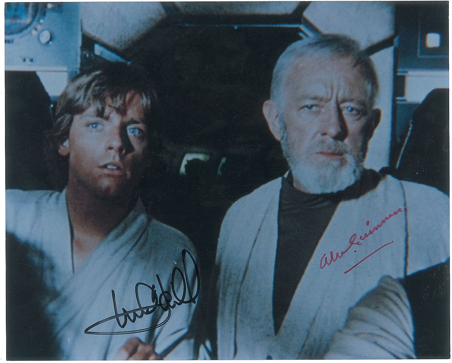 Uncommon color glossy 10 x 8 photo of Luke Skywalker and Obi-Wan Kenobi in Star Wars, signed in black felt tip by Mark Hamill and in red felt tip by Alec Guinness. In fine condition, with slightly grainy image quality. Accompanied by a full letter of authenticity from PSA/DNA.