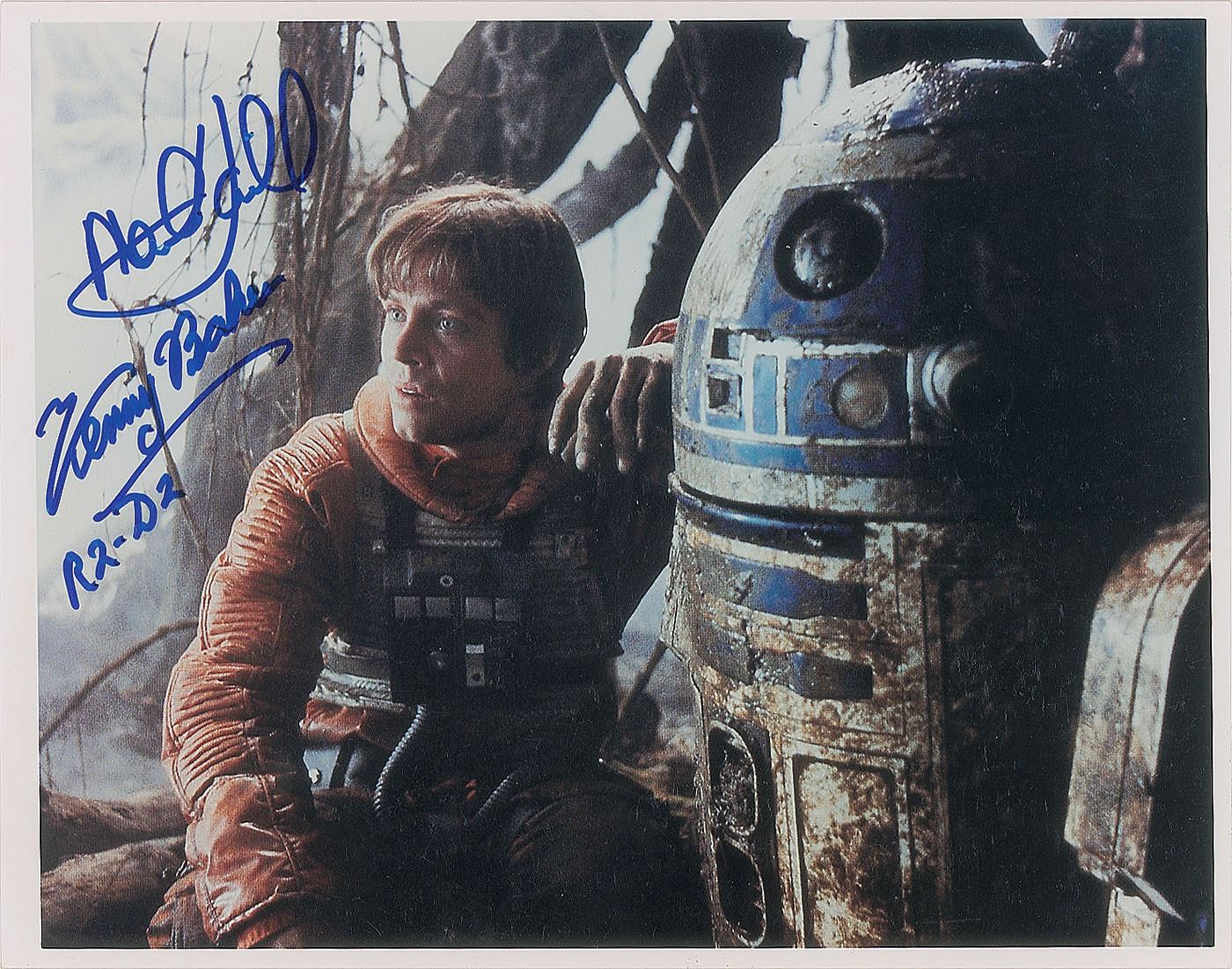 Color glossy 10 x 8 photo of Luke Skywalker and a muddy R2-D2 following their landing on Dagobah in the 1980 sci-fi film The Empire Strikes Back, signed in blue felt tip, "Mark Hamill" and "Kenny Baker, R2-D2." In fine condition.