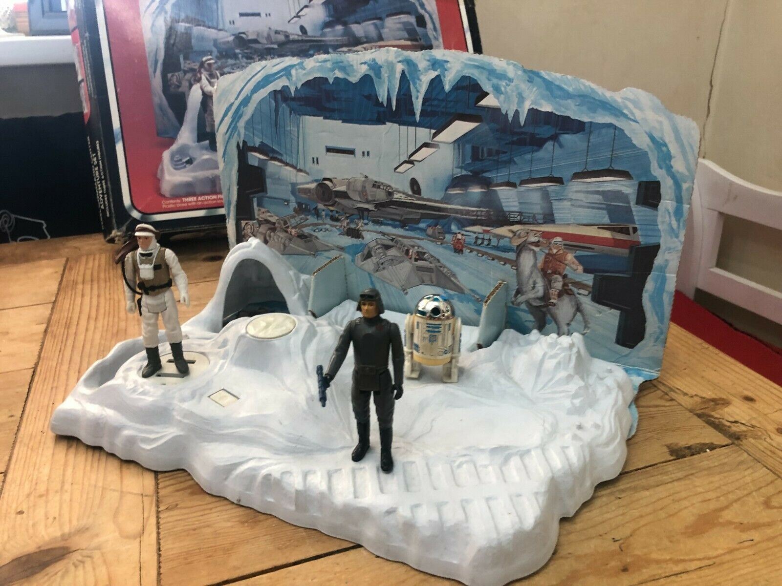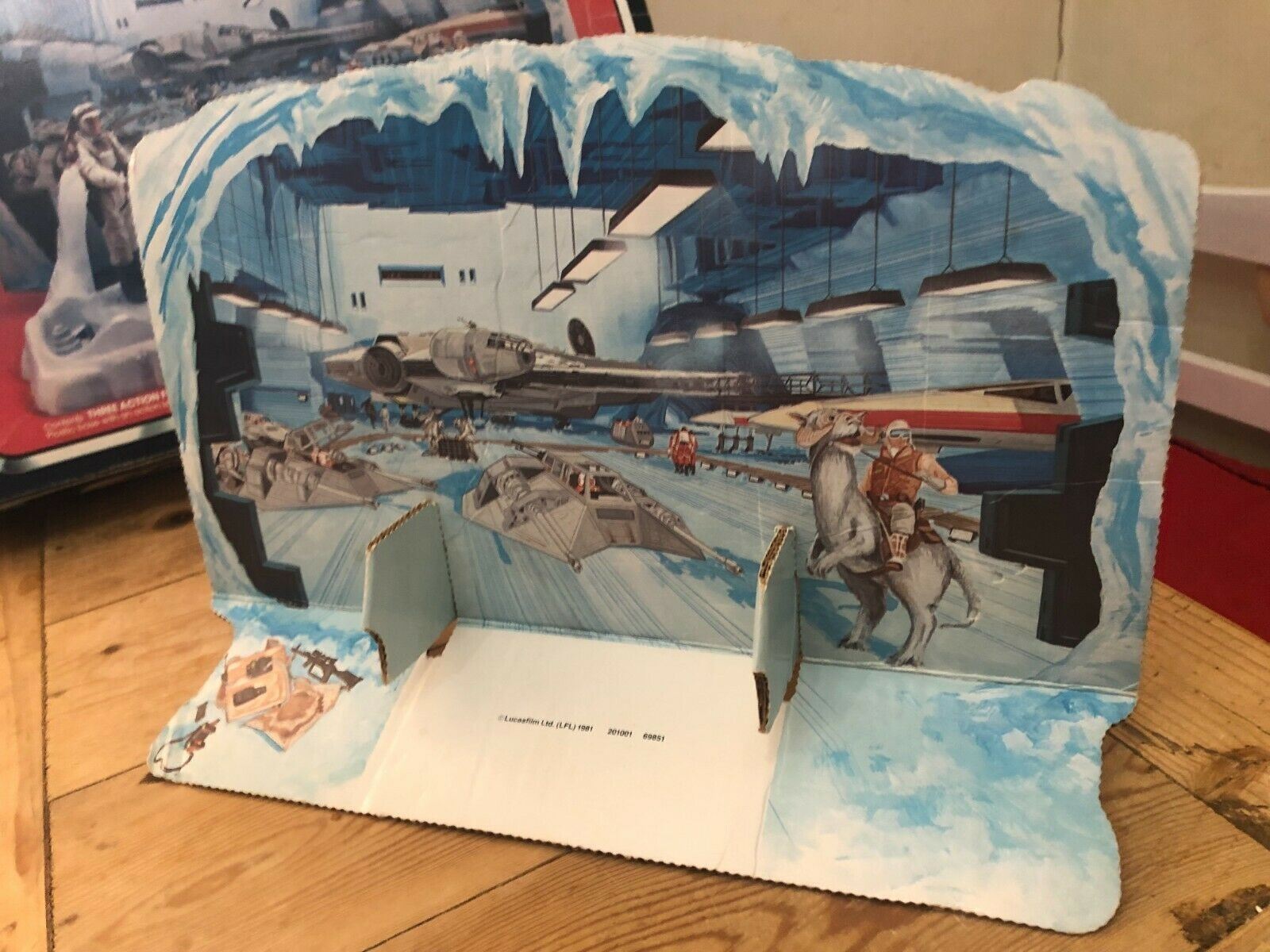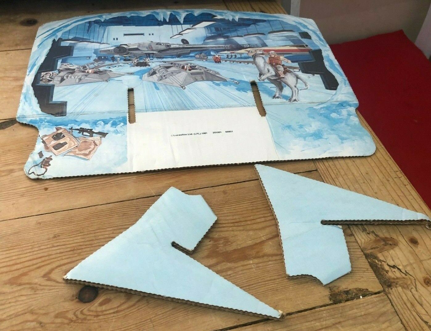 Good condition, complete with the 3 action figures base, cardboard backdrop and stands. Scarce original item with plastic base and cardboard rear diorama. Action figures have original weapons. R2D2 has original sensorscope and stickers, there is wear to R2's sticker. Box has some signs of ageing and a couple of minor tears, Please see photographs.