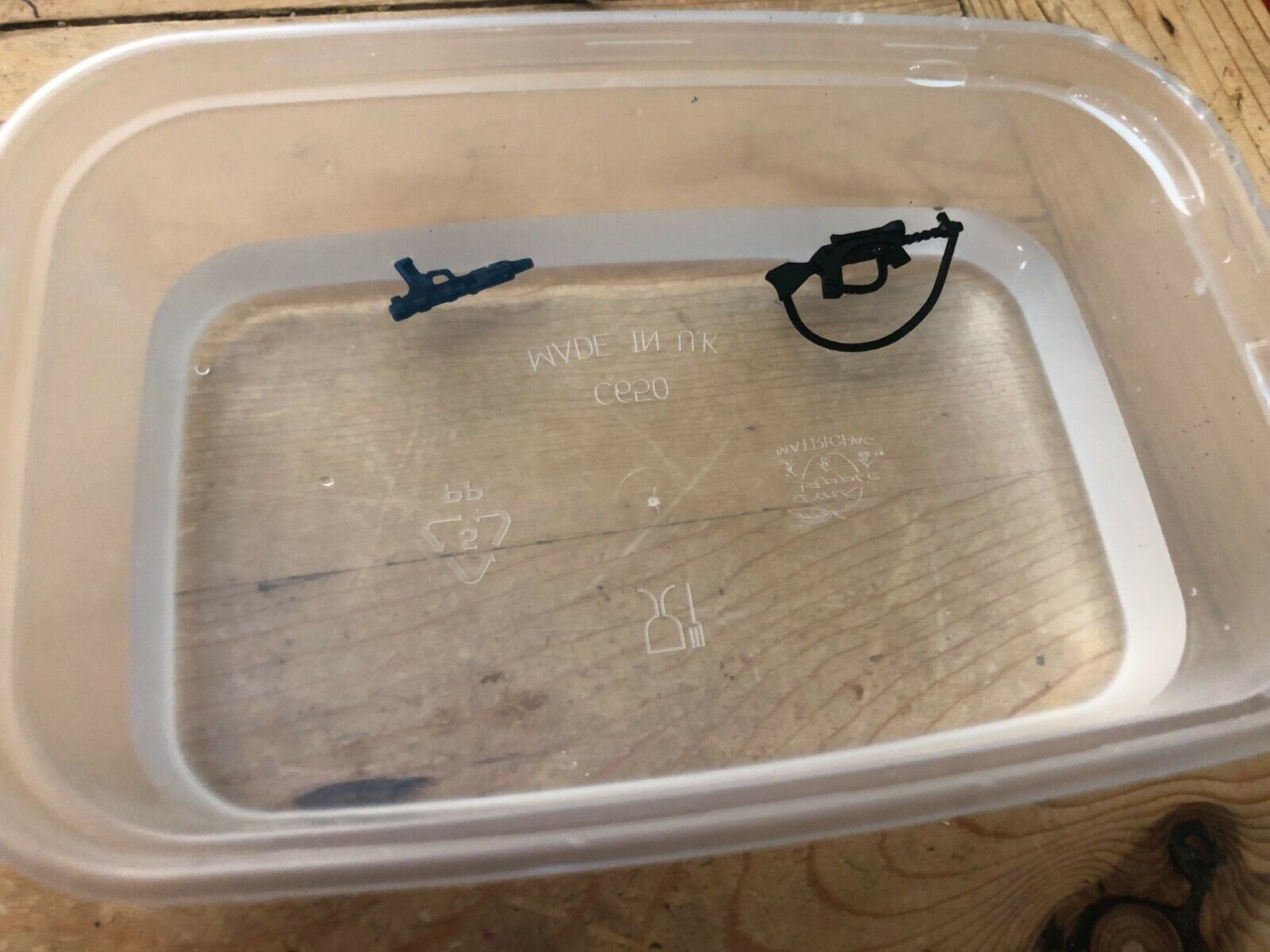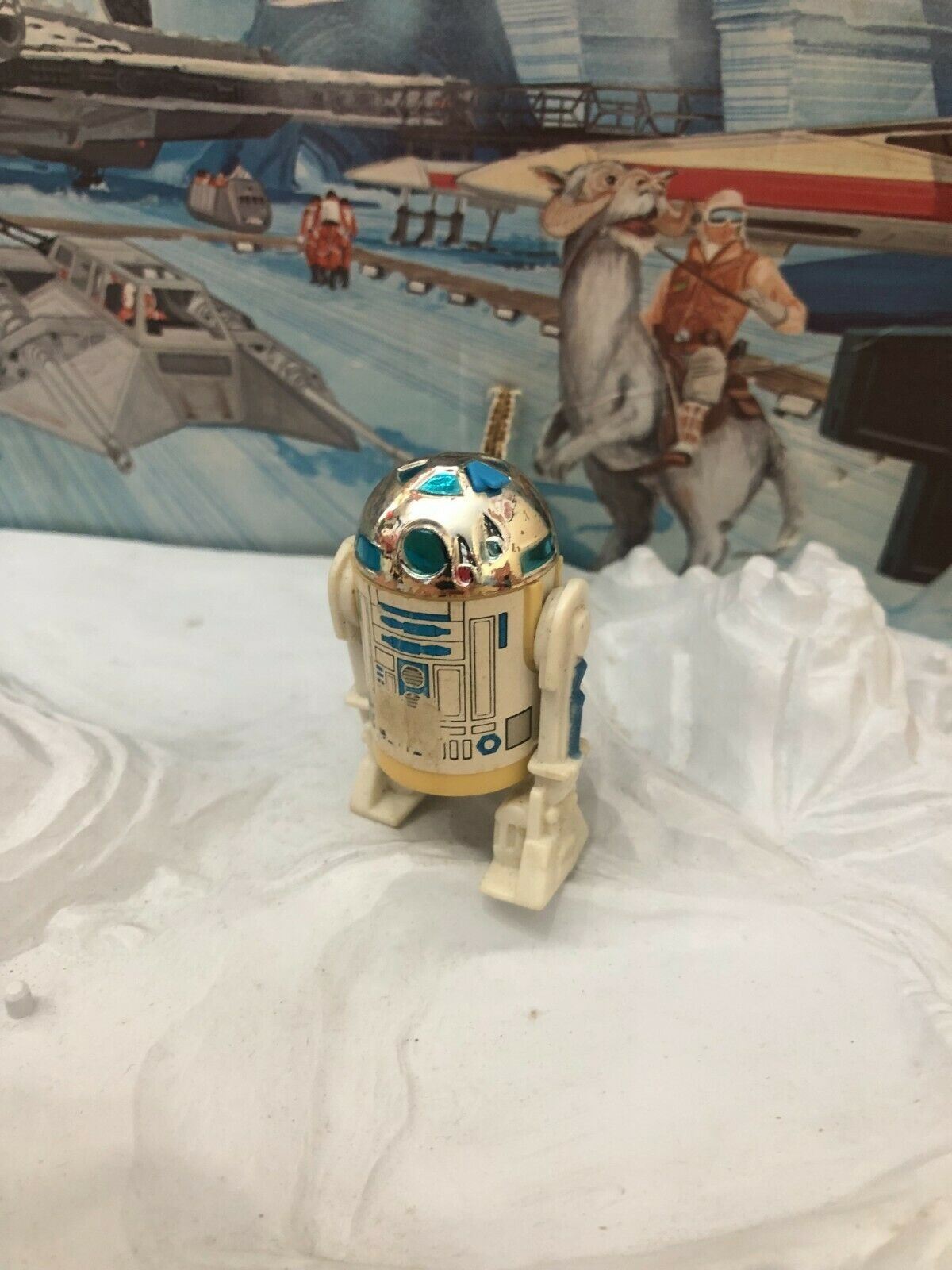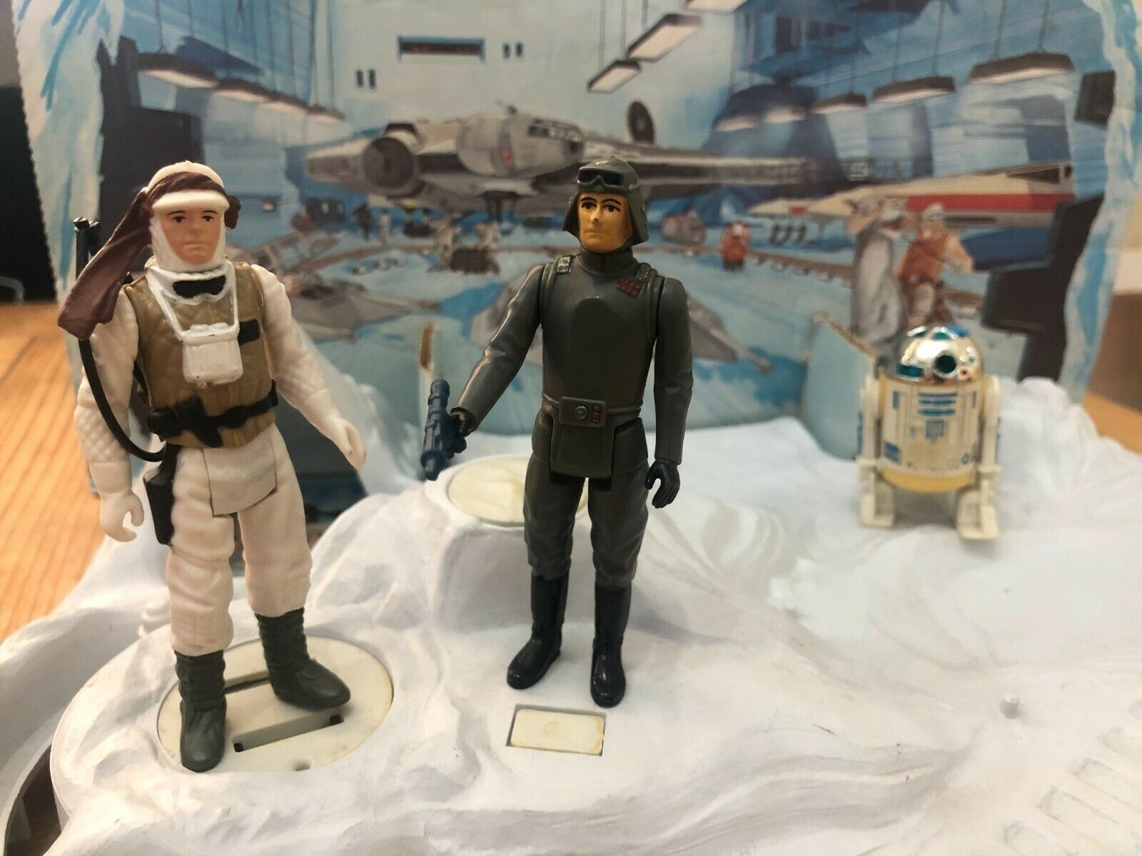 Good condition, complete with the 3 action figures base, cardboard backdrop and stands. Scarce original item with plastic base and cardboard rear diorama. Action figures have original weapons. R2D2 has original sensorscope and stickers, there is wear to R2's sticker. Box has some signs of ageing and a couple of minor tears, Please see photographs.