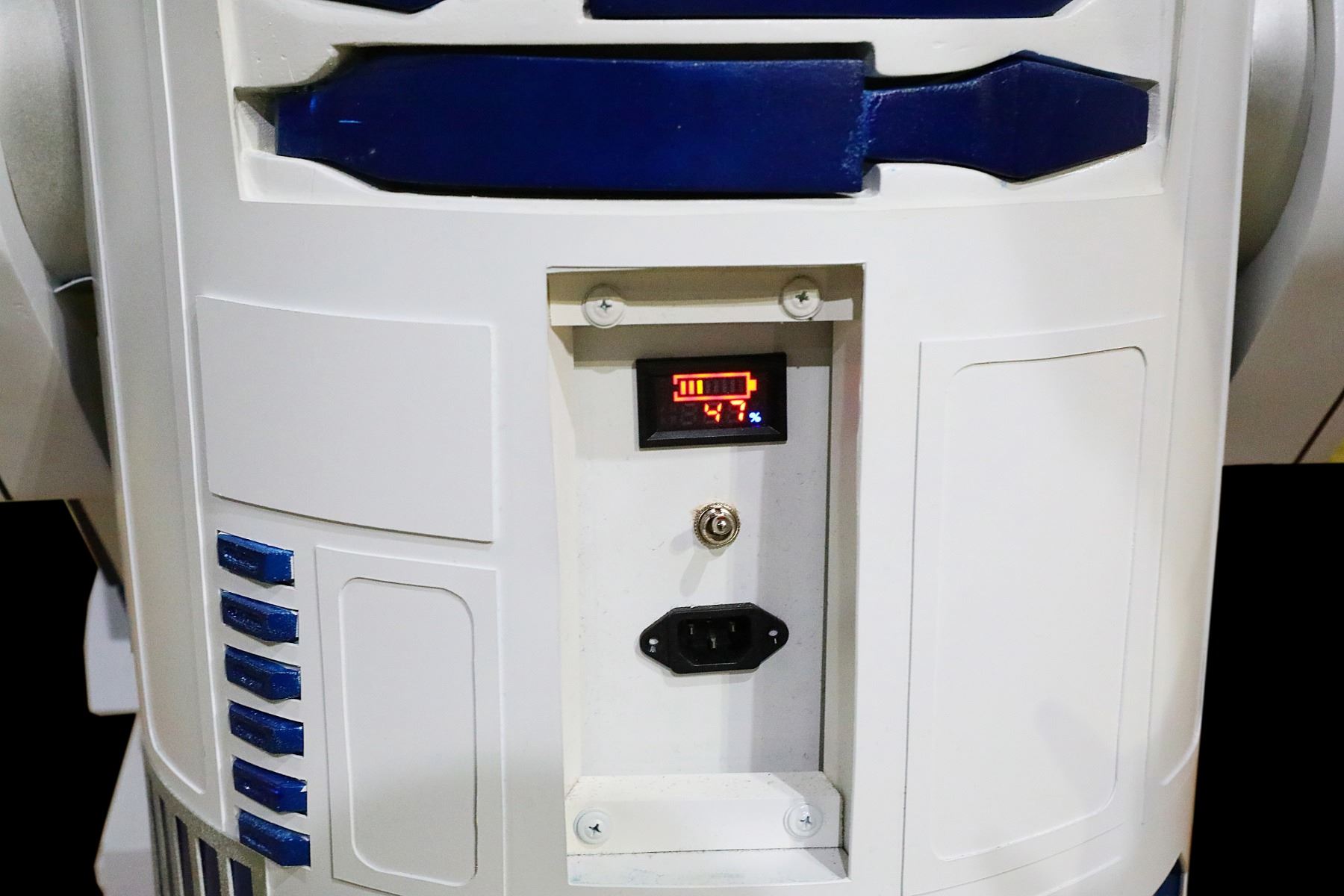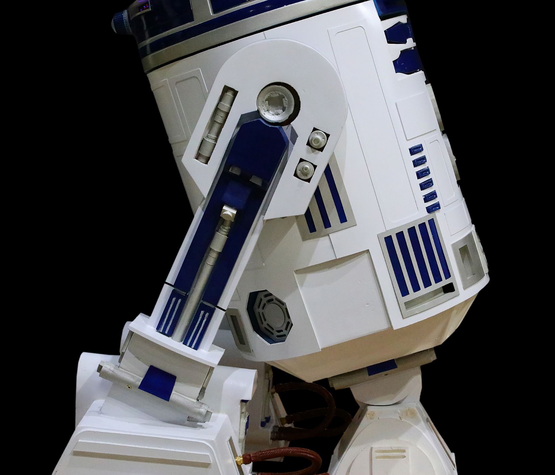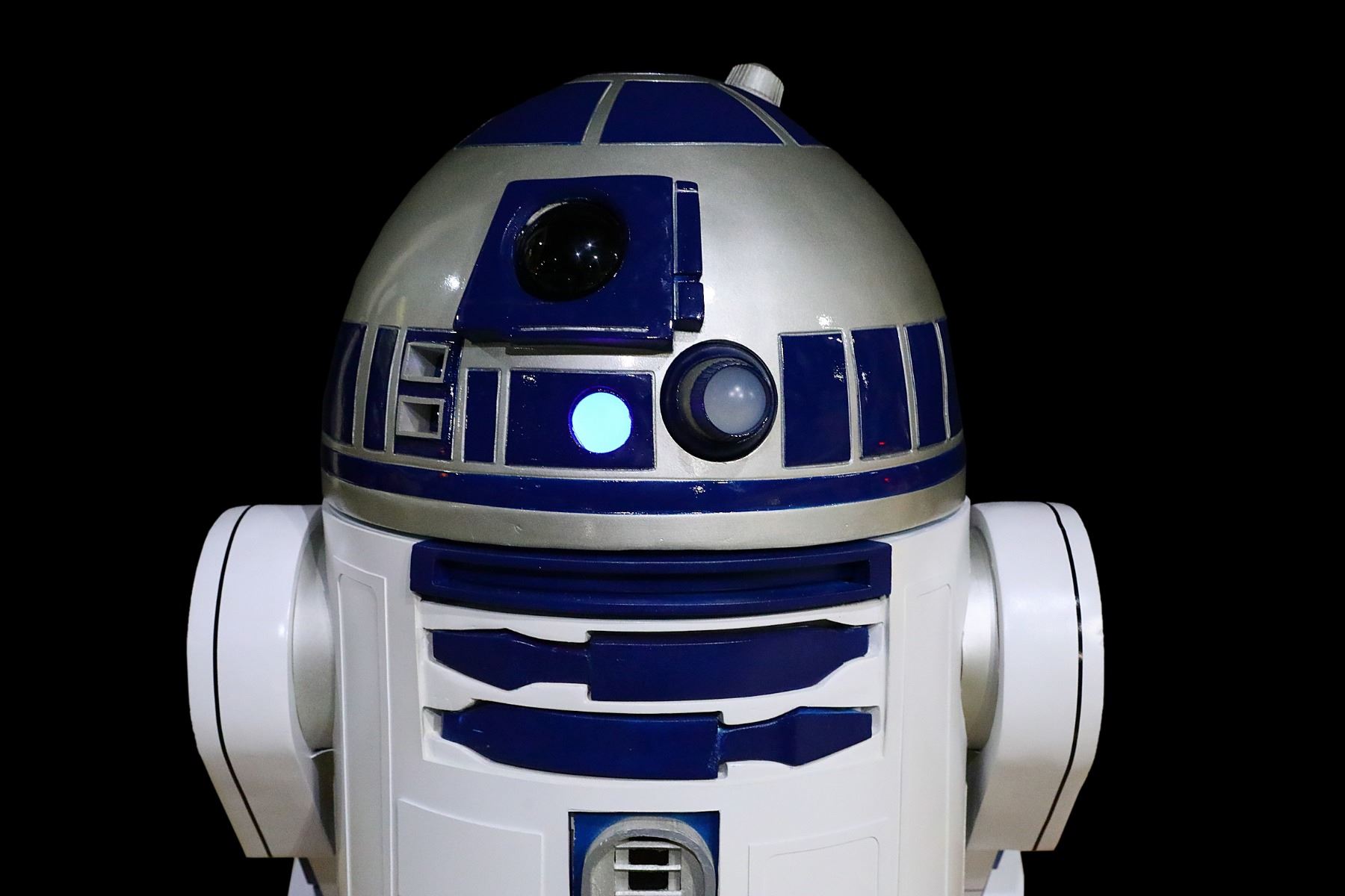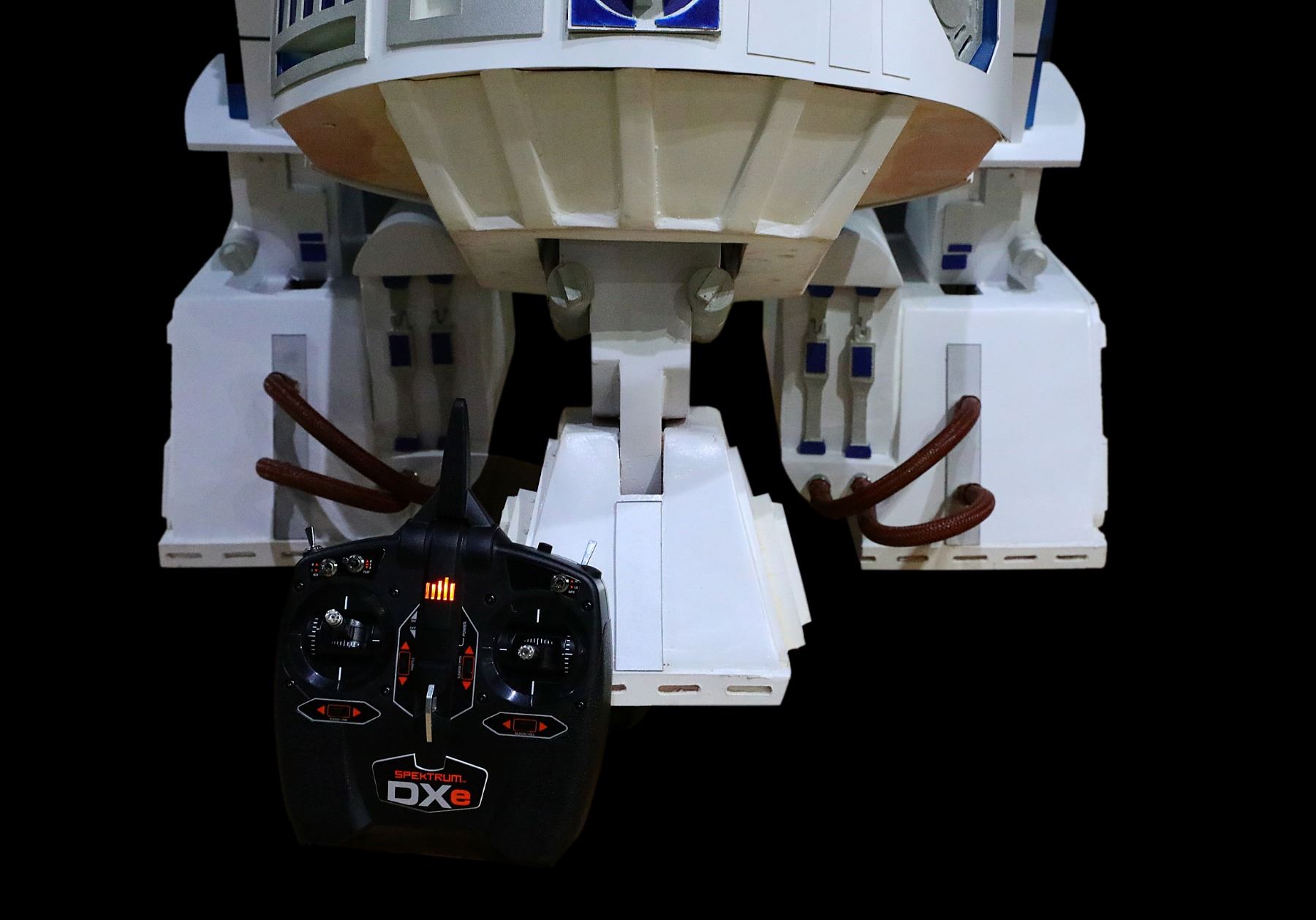 Star Wars Life Size Remote Controlled R2D2 W/Working Lights & Sounds - This incredible piece is a life sized remote controlled R2D2 replica. These rare, life size working replicas almost never come available. R2D2 features a full motion remote controlled system with Spektrum wireless radio controller, rotating dome that can rotate a full 360 degrees while in motion, automotive sound system mounted under the dome and pre-loaded MP3 player for sound effects which can be triggered by the remote or by motion sensor, working lights, transmitter and receiver. The R2D2 also features a motor controller for the drive wheels, electronic speed controller for dome rotation, two 12 volt 5.5 amp hr rechargeable batteries, individual 9 volt battery for dome lighting, legs powered by 12 volt 3.5 amp heavy duty motors connected to 5" rubber wheels and removable dome for storage and transportation. R2 measures approx. 44"H x 28"W, and weighs approx. 75 lbs. The piece will come with the charging cord.