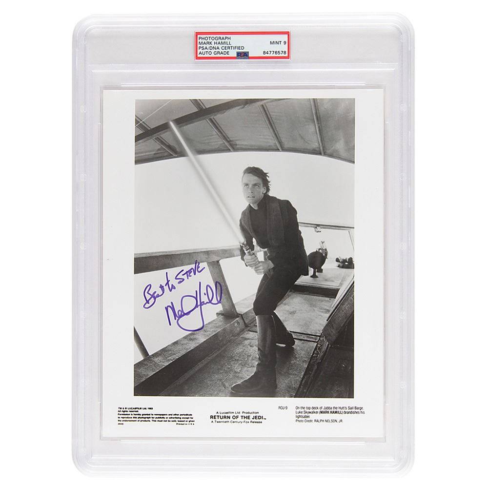 Glossy 8 x 10 20th Century-Fox publicity photo of Mark Hamill as Star Wars hero Luke Skywalker in the 1983 sci-fi classic Return of the Jedi, signed and inscribed in purple felt tip, "Best to Steve, Mark Hamill.& rdquo; In fine condition. Encapsulated and graded by PSA/DNA as "MINT 9."