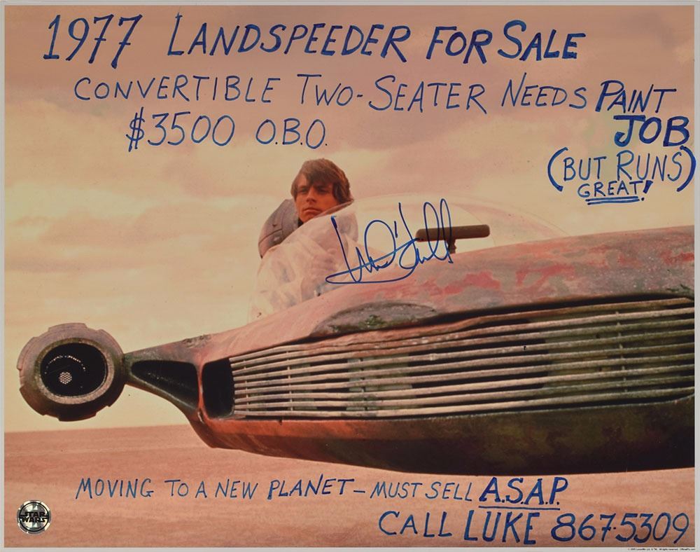 Fantastic color satin-finish 20 x 16 photo of Luke Skywalker cruising in his trusty X-34 Landspeeder, signed in blue felt tip by Hamill, who adds a humorous 'for sale' advertisement: "1977 Landspeeder For Sale, Convertible Two-Seater Needs Paint Job (But Runs Great!), $3500 O.B.O., Moving To A New Planet—Must Sell A.S.A.P., Call Luke 867–5309." Lower left corner bears an affixed Official Star Wars Photograph label. Rolled and in fine condition.