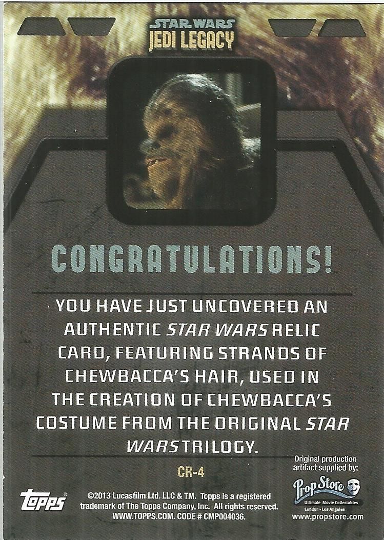 From the Legacy card set, the RAREST of all the possible chase cards, a documented piece of Chewbacca fur! These are bringing $300.00 plus on eBay!