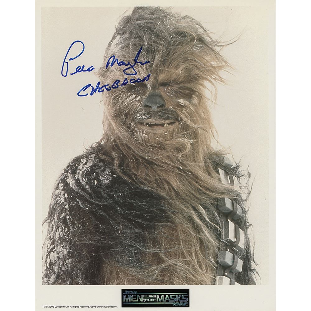 Color 8.5 x 11 cardstock photo from the Star Wars: Men Behind the Masks tour, signed in blue felt tip, "Peter Mayhew, Chewbacca." In fine condition, with a light crease near the top edge.