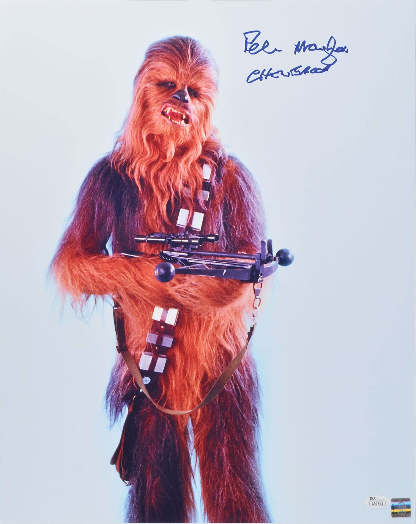 Color satin-finish 16 x 20 three-quarter-length photo of Chewbacca, the Wookiee copilot on Han Solo's Millennium Falcon spaceship, signed in blue felt tip, "Peter Mayhew, Chewbacca." In fine condition, with Peter Mayhew and JSA labels affixed to lower right corner. Accompanied by a certificate of authenticity from JSA.
