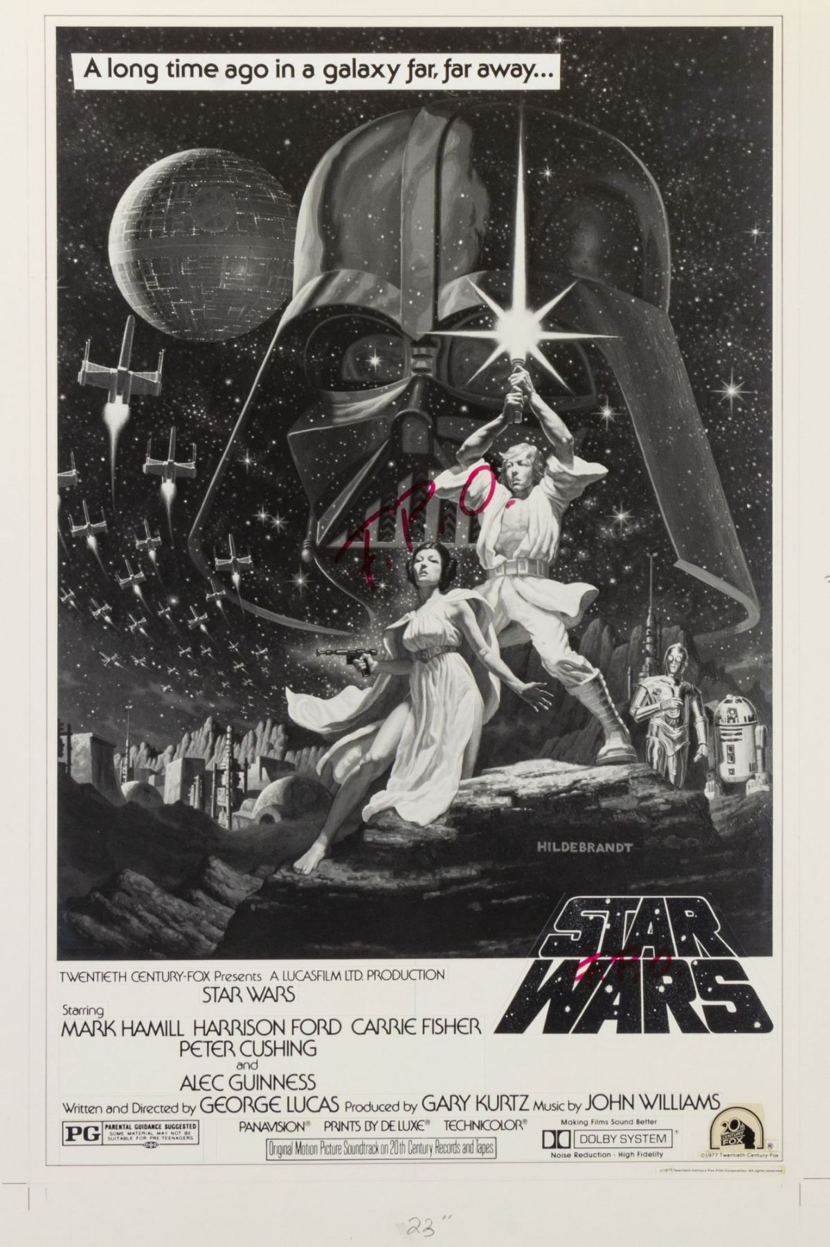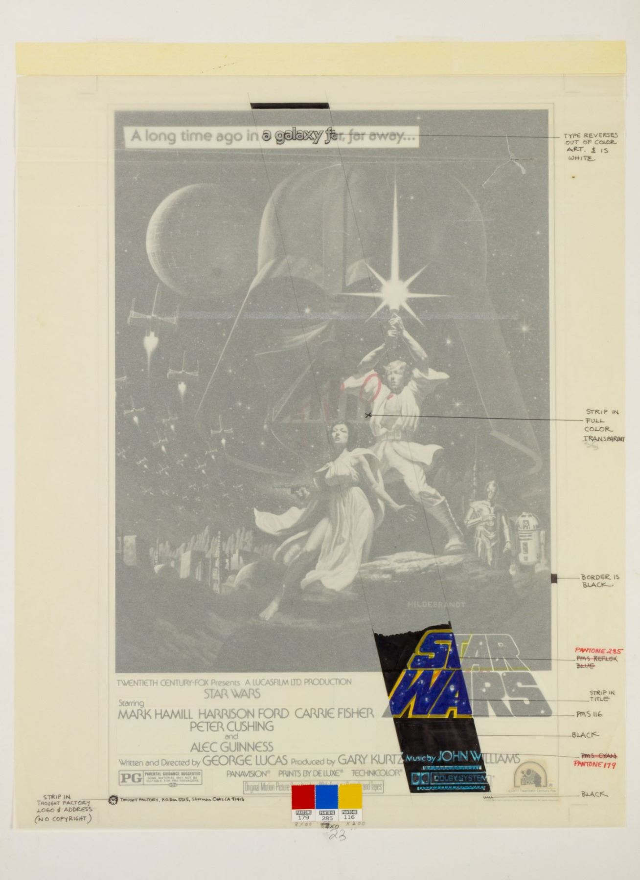 (20th Century Fox, c.1977) Original development artwork featuring incredible poster concept art by the Hildebrandt brothers for "Star Wars". The artwork features printed poster imagery that is hand-trimmed and applied on art board, and includes a vellum sheet hinged over the artwork that has Pantone color codes and samples for the "Star Wars" logo text in the bottom-right. The artwork is labeled "F.P.O or "For Placement Only". "F.P.O." development artwork such as this allows the design team to continue working on the project using non-finalized artwork while aspects of the final artwork are still being completed. This artwork provides a rare glimpse into the creation of promotional materials for this iconic film, and was created on a 28"x20" art board. The condition is very good with some tears and creases in the vellum, some edge-wear to the board, and some general wear from use.