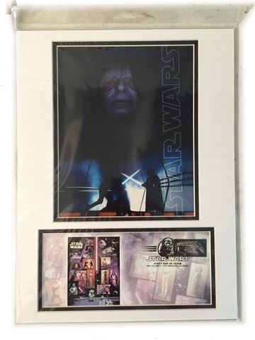 An 8" x 10" photo of Emperor Palpatine (from Return of the Jedi) blended into a smaller image of Luke Skywalker and Darth Vader in their first battle in Cloud City (The Empire Strikes Back). The words "Star Wars" as written in the opening crawl are on the right side of the entire image from top to bottom. Below the main image is a 9 3/4" x 4 1/2" promotional card displaying various poster images throughout the saga, ranging from A New Hope (1977), to Revenge of the Sith (2005). An image of Darth Vader lies above the words, "First Day of Issue May 25, 2007 Los Angeles, CA 90052", referring to the 30th Anniversary release of Star Wars in 1977, and the Millennium Falcon postage stamp that sits in the top right corner. These items are secured between 2 layers of cardboard to prevent bending or twisting.
