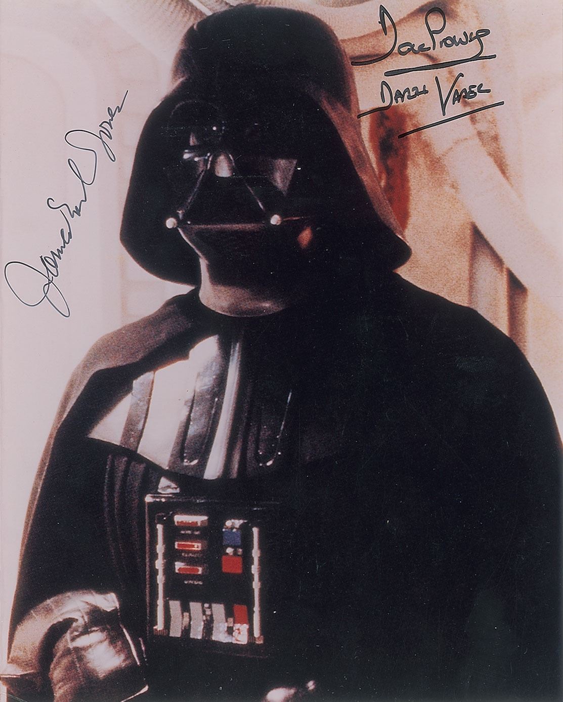 Color semi-glossy 8 x 10 of Darth Vader, the main antagonist in the original Star Wars trilogy, signed in black felt tip, "James Earl Jones" and "Dave Prowse, Darth Vader." In fine condition, with a light paperclip impression to the lower right edge.