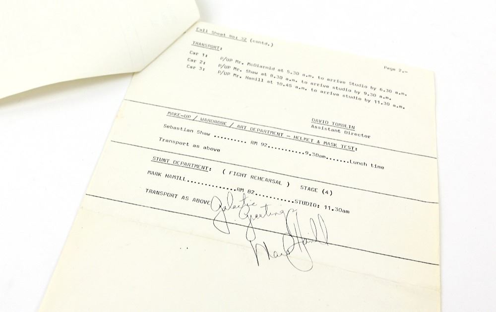 Star Wars Return of The Jedi (1983) - Revenge of The Jedi call Sheet from Tuesday 23rd February 1982, two pages, signed on the second page by Mark Hamill - 'Galactic Greetings! Mark Hamill', 13 x 8 inches.Provenance: The Vendor was part of a group of children invited to the set at Elstree studio by the 1st AD (Dave Tomblin) and Jo Gibson (Mark Hamill's stand in) who were both friends of his Father and a member of the same Social club at Mill Hill (along with many other members of the crew).Â